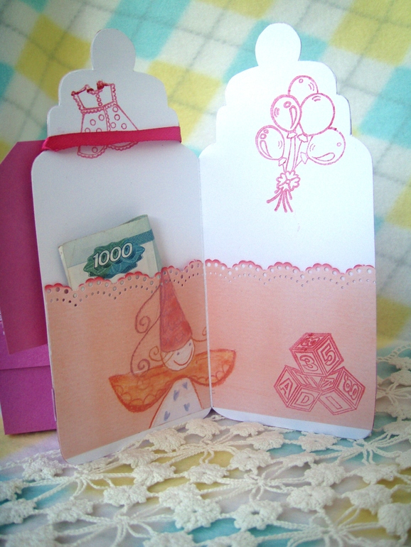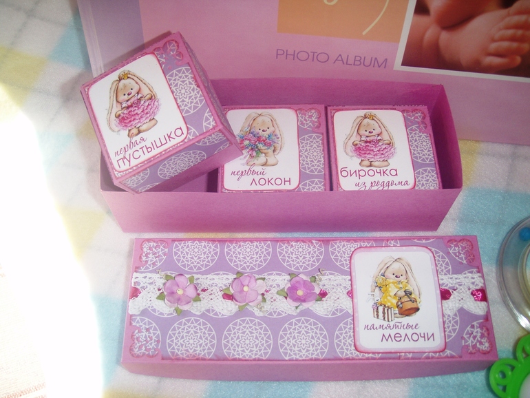 Очередная классическая коробочка маминых сокровищ и плюс к ней открыточка в виде бутылочки, думаю хороший вышел комплект на рождение Малышки.
