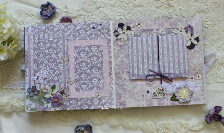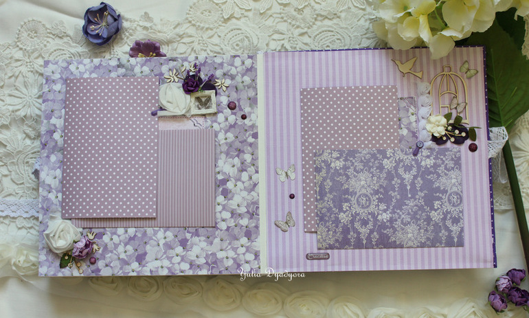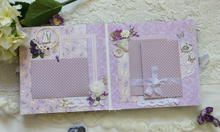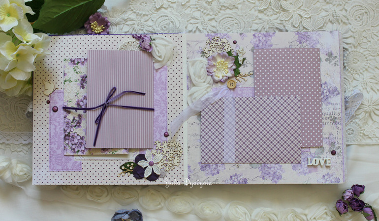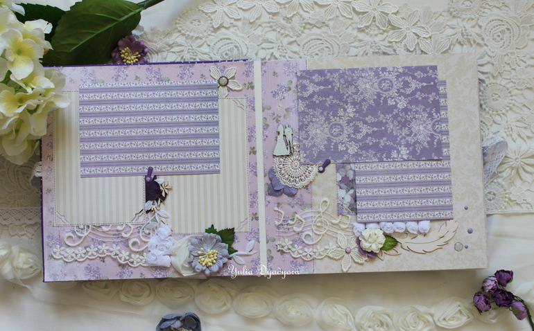 Хочу поделиться фотографиями альбома, сделанного для молодоженов, чья свадьба была оформлена в сиреневых тонах. Кроме цветовой гаммы, других пожеланий не было, поэтому я оторвалась от души)) Альбом 25 на 25 см, рассчитан на 52 фотографии стандартного размера.