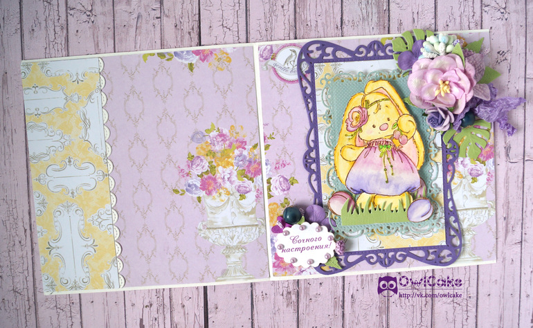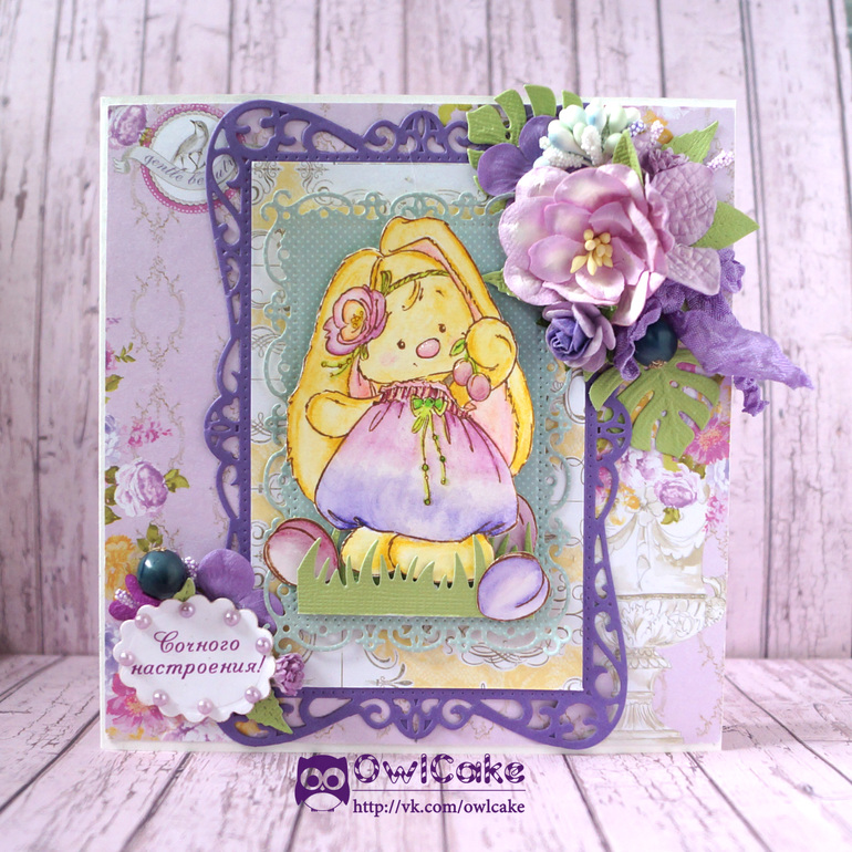 Сливовая открыточка с милой зайкой, собирающей урожай спелых фруктов.Такая летняя , теплая и ароматная.С шикарным сиреневым букетом, украшенным ягодками и нежной ленточкой.