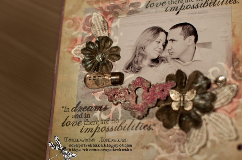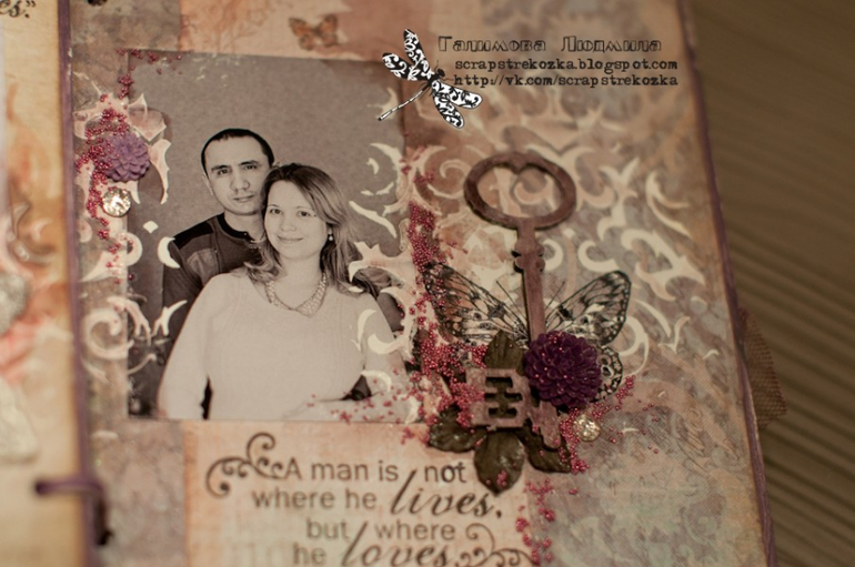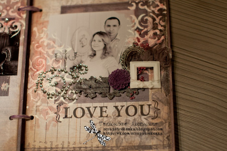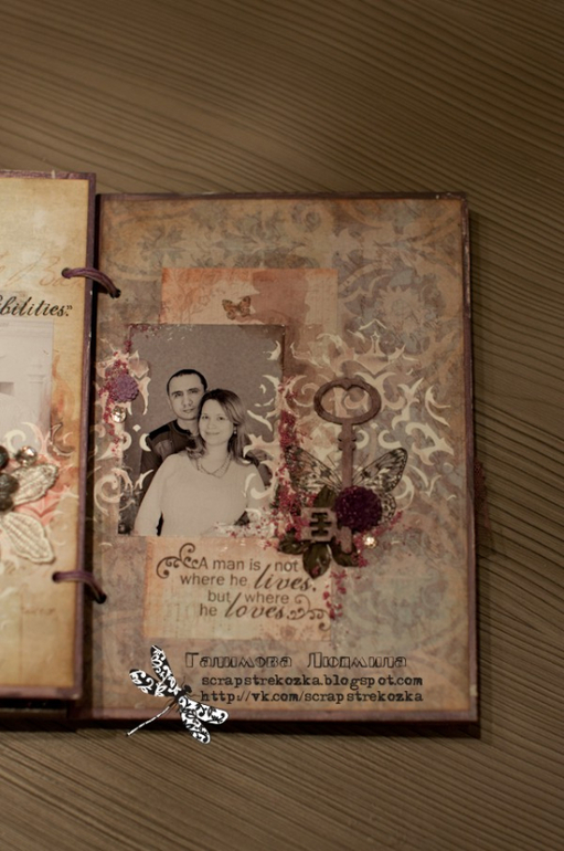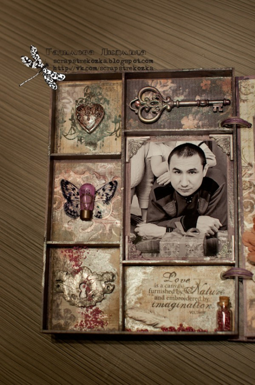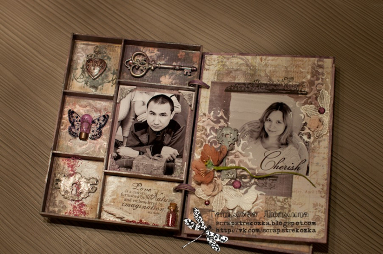 Первый разворот с шедоу-бокс. Это мой первый бокс, не идеально, но мне нравится. Решила не перегружать декором, все таки это альбом, а не арт-объект. Формат 15х20 приблизительно. 3 разворота про меня и мужа, ну, и про любовь в общемто! ;)