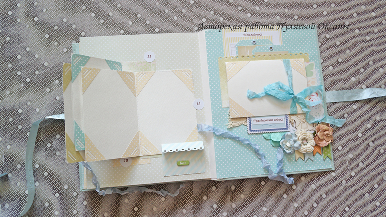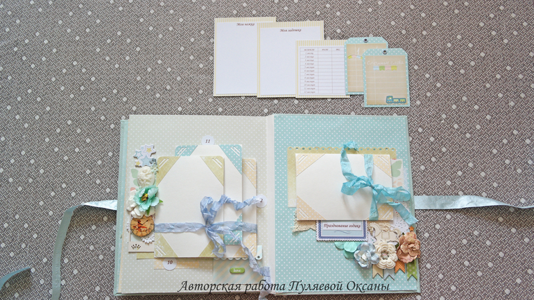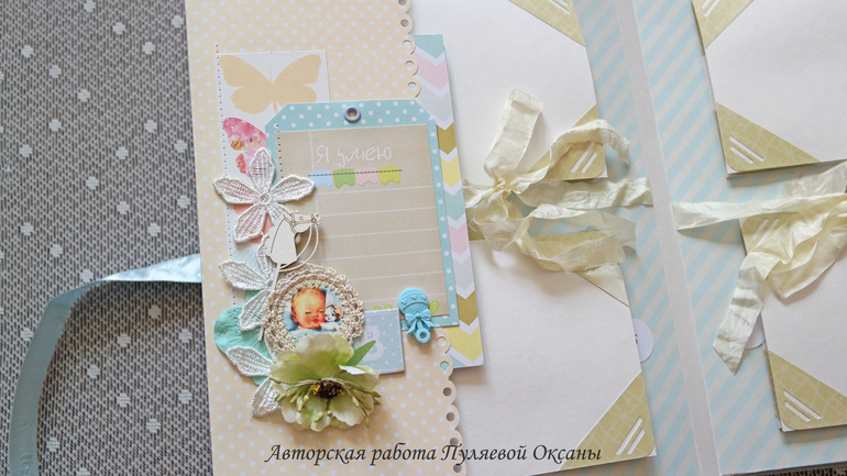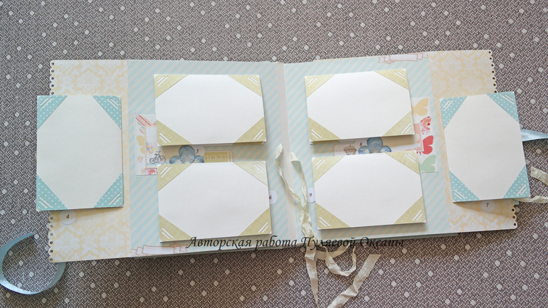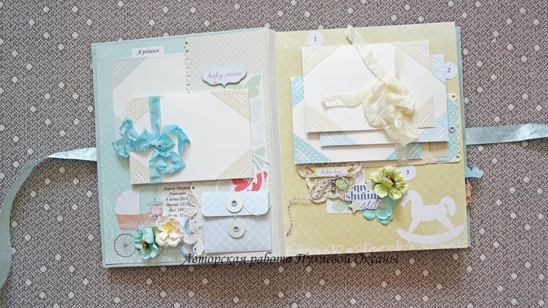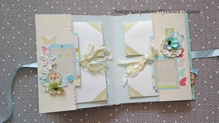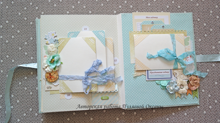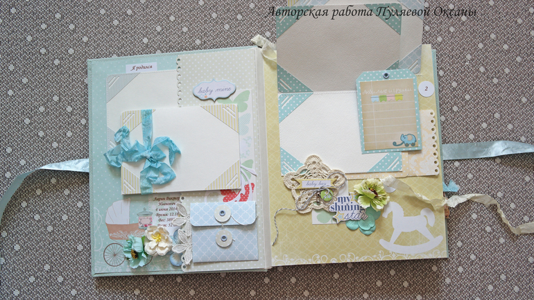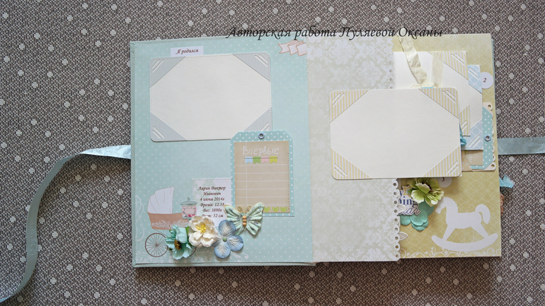 Альбомы ДетскиеВсем добрый вечер! В последнее время у меня заказывают один и тот же альбом для мальчика, но я каждый раз стараюсь вносить новые моменты как в сам альбом,так и на обложку. Хочу сегодня показать вам нежный альбом для малыша Виктора! Альбом тематический - есть страницы про рождение, семью малыша, месяца от рождения до года и др. Обложка из очень красивой ткани Тильда, которую украшает детский комплект. Формат 24 на 28 см, 3 разворота, 6 страниц, поместилось около 40 фото 10 на 15, таблички - ножка, ладошка, метрика, первые слова, карманы для зубика и локона. Есть потайные странички, где прячутся фото и карточки для важных заметок. Больше фото в моем . Спасибо за просмотр!