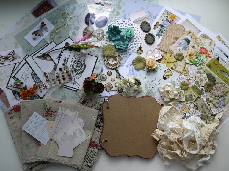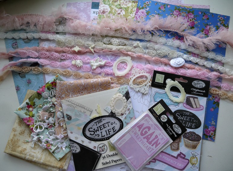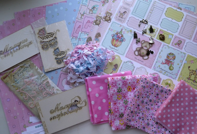 6 листов 30 на 30, 6 листов А4 прима, ленты в среднем 60 см, ткани 45 на 25 3 штуки, карточки для украшения альбома, вкууусные, чипборд, бумага мелиса францес 15 см 31 лист, украшалки.