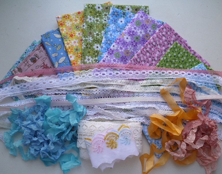 Здесь на фото 10 тканей, одну голубую и одну розовую у меня успели купить подружки, не донесла. Итого 8 кусков ткани 50 на 50 см, ленты 60 см в среднем, кружево из мамино сундука длинное очень.