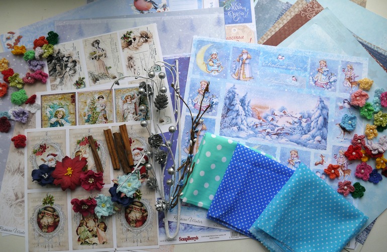 8 листов скрапбериз Русская зима, 15 листов Флер дизайн, 3 скрап карты скрапвел, 3 ткани 45 на 25, украшалки