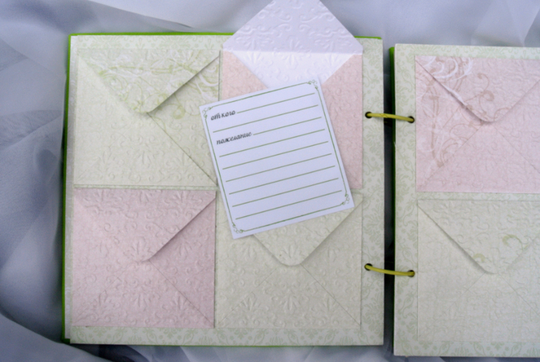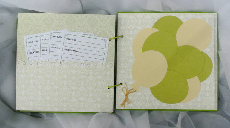 Книги пожеланий, чековые книжки, книжки желаний, кулинарные книгиПривет девочки! Поздней ночью хочу вам показать книгу пожеланий на свадьбу в зеленом цвете. В ней нет ни цветочков, ни каких других украшений. она строгая, но в то же время интересная. и в ней только бумага) очень тяжело когда хочется что то добавить). На обложке пара с шариками, потому что на свадьбе гости будут на специальном листе отпечатками своих рук делать имитацию воздушных шариков, так что тематика должна прослеживаться и на книге) Во всей кгниге карманы, в которых листы для поже6ланий молодым. Конверты в них тоже листы для пожеланий. Пазл интересно) это тоже для пожеланий, но много не напишешь. Также шарики тоже для пожеланий, многие гости же не умеют красиво желать, а здесь можно несколько слов написать. Внутри цвет бумаги светло-зеленый, жаль по фото не особо видно(