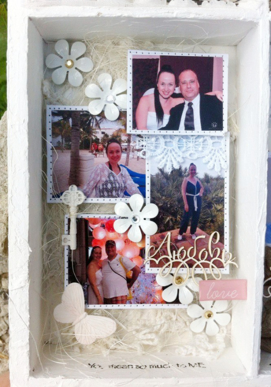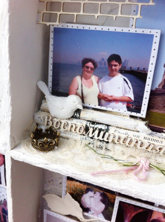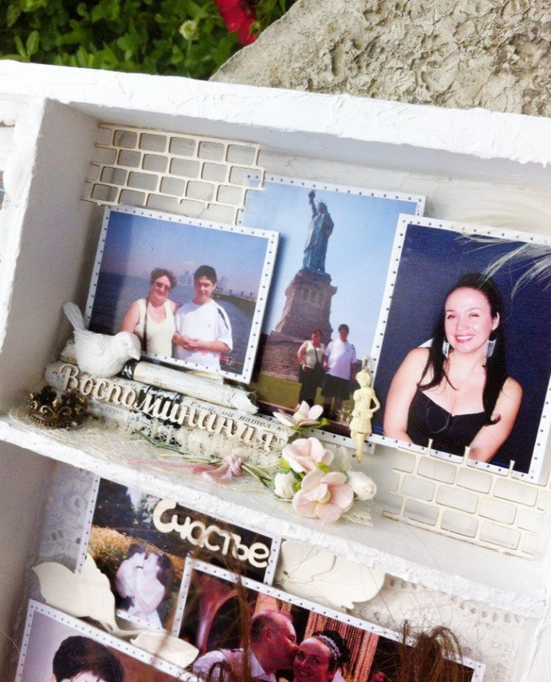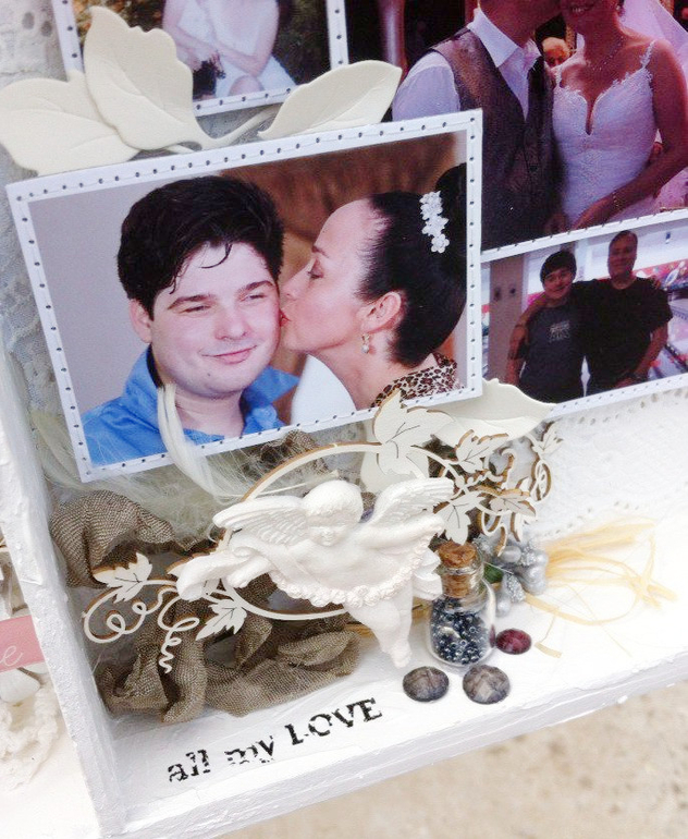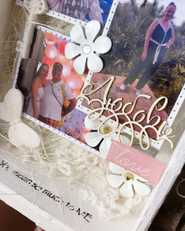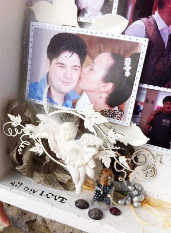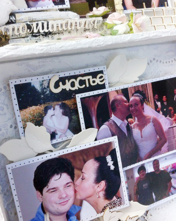 В основе деревянная заготовка 30х30 см, покрыта текстурной пастой и сверху белой акриловой краской. в оформлении использовано кружево, чипборд, эмаль, рафия, шелковые ленты, перья, вырубка, лепнина.