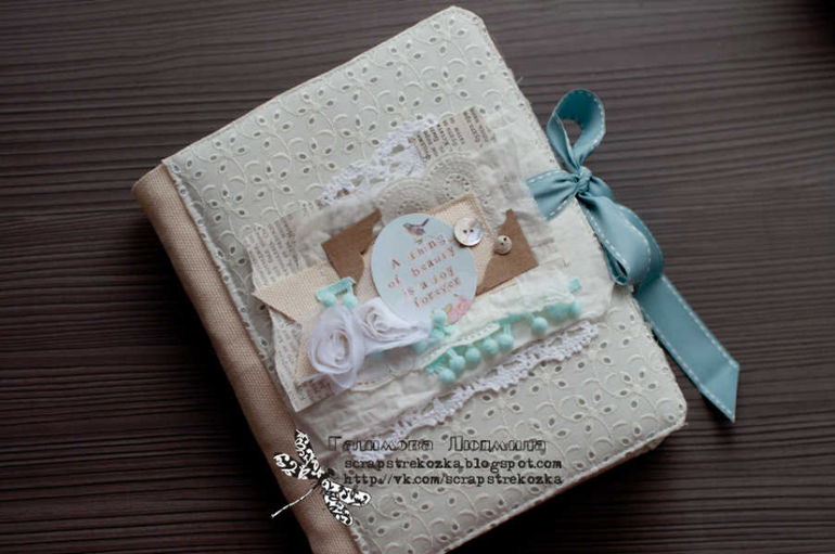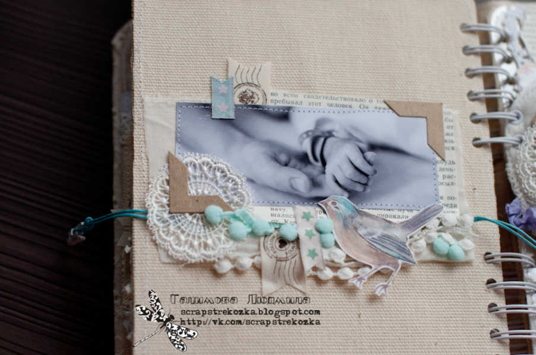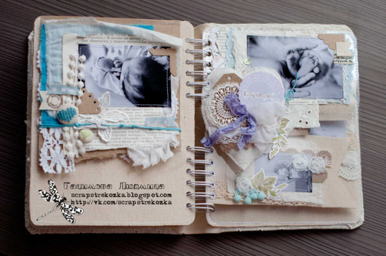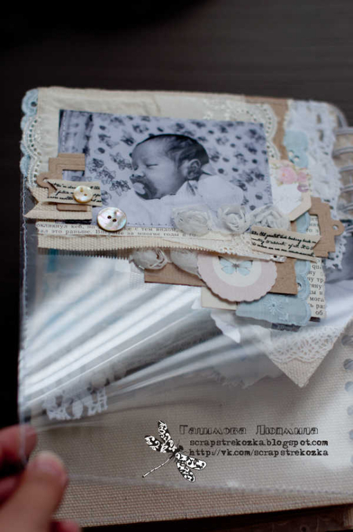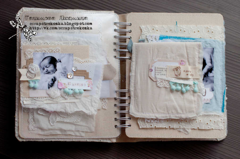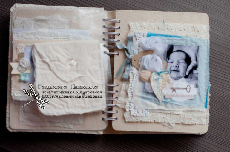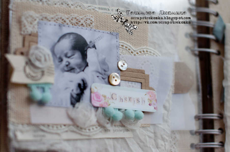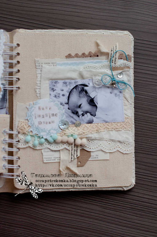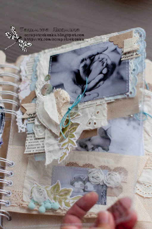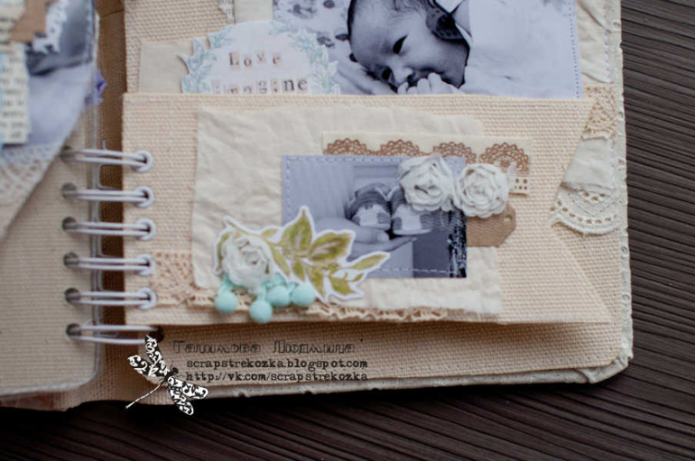 Формат 18х23см, 4 разворота и теги, альбом на пружине в мягкой кружевной обложке. В работе была цель - не использовать скрап-материалы, поэтому их здесь по-минимуму: немного высечки, подвески, остальное - текстиль, кружево, ленты, пуговки, крафт-бумага.