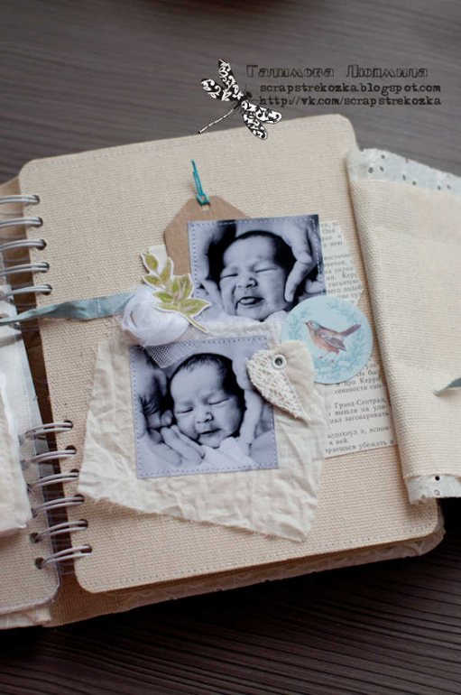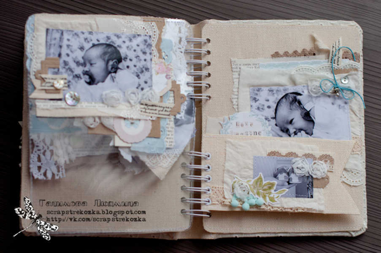 Альбомы ДетскиеПокажу еще один альбомчик. Давно хотела сделать что-то из ткани и кружев, но мне все не нравилось, что в тканевых альбомах странички мягкие. Поэтому я решила их сделать иначе: часть страниц сделана из картона, обтянутого тканью, а часть элементов сделала мягкими, текстильными, плюс любимые мною прозрачные странички. Весь альбом получился нежным и воздушным и посвящен он самому сладкому моменту: моменту рождения моего младшенького сыночка. На фотографиях ему всего 5 дней от роду.