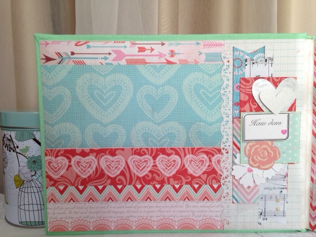 Альбом заказан без подложек для фото . Бумага забавная и веселая - как и хотелось заказчице. Мне было немного сложно, так как спокойных листов почти не было, большая часть активного рисунка. Место для фото сделала спокойным - так как потом там еще будут фото.