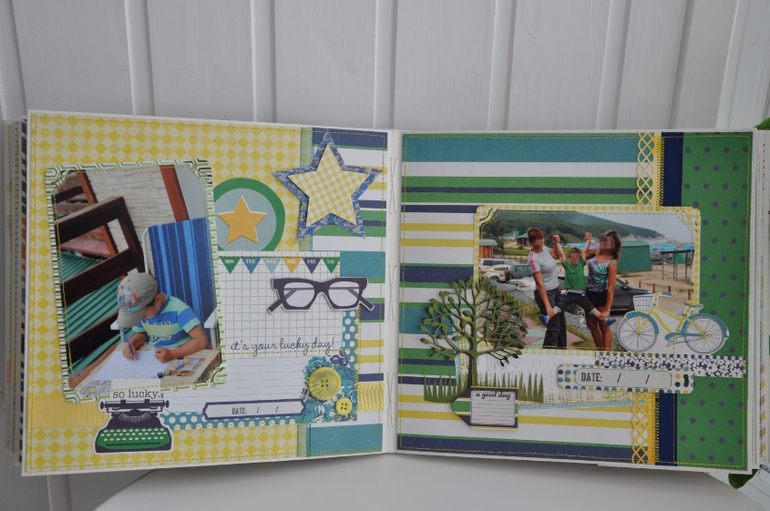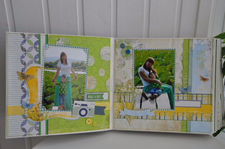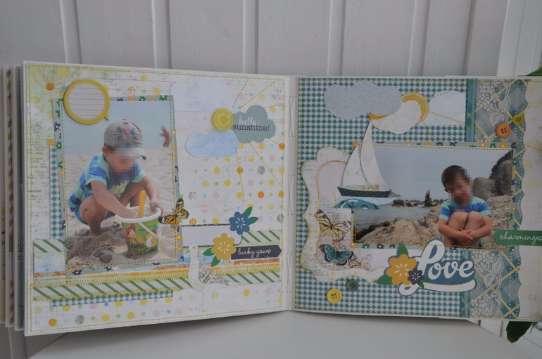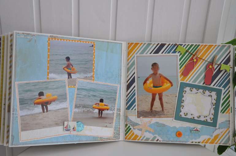 Альбомы ДетскиеКонечно проще и интереснее всего делать альбом, когда мне дают сразу фотографии. Это позволяет вписать их в дизайн бумаги наиболее удачным образом. Вот пример из моих последних работ. Семья съездила в приморье, им хотелось динамичный, яркий и сине-зеленый альбом. Я использовала бумагу My minds eye, Simple stories и еще какие то листы подходящего цвета. В альбом есть мои аппликации, которые я без машинки вырезаю руками - чайка, яхта ракушки шлепки на веревочке... а также тканевые цветы которые я сама делаю из остатков хлопка который используется для обложек. Размер 25-25 см. 20 разворотов = 40 страниц. Половина оформлена в технике скрапбукинг, а половина оставлена для того чтобы туда могли вклеить не самые замечательные снимки из поездки, но которые все равно хочется сохранить.
