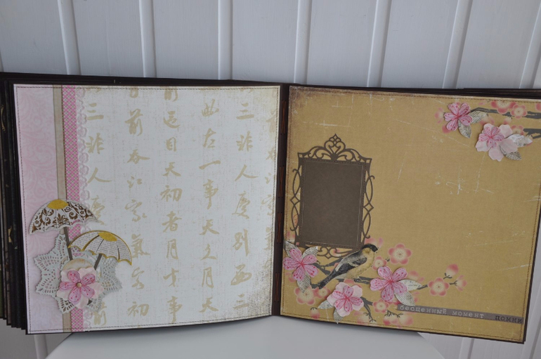 Переплет мой традиционный, прошитый и проклеенный. Развороты чередуются, один имеет зазор 7 мм, другой как в обычном альбоме. Дизайн обложки в духе японских бамбуковых панелей с росписями.