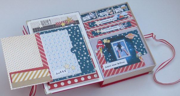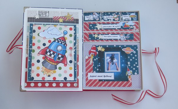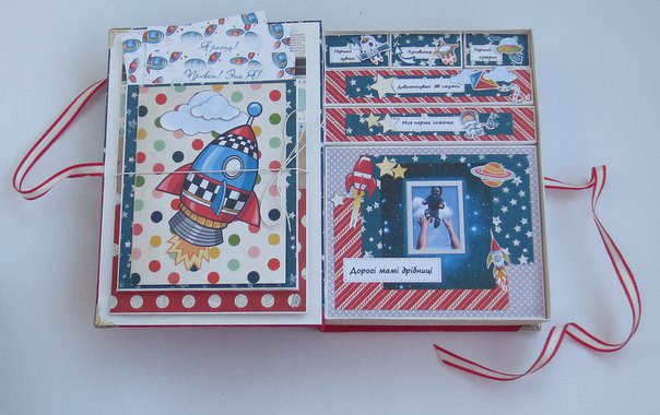 Спасибочки)) Бумага абсолютно разная)) Сейчас попытаюсь написать, какая именно)...Multi Dots CBIC24005; Simple Stories — Say Cheese — Title Strips; Simple Stories — I Heart Summer — Sunshine & Laughter,- не знаю, правильно ли написала (скопировала названия из группы, где заказывала — это 3 листа 2-х сторонние))) Синие звезды — это Скрапберриз (коллекция про цирк), красные полоски — Echo Park. Плюс распечатывала картинки (ракеты, космонавта и т.д.)
