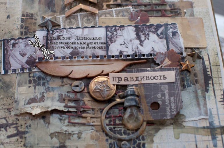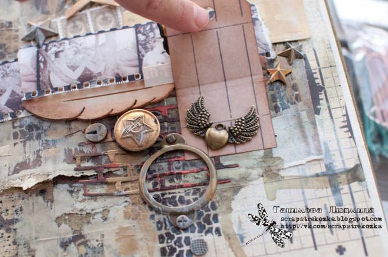 Космический альбом. Раза три разглядывала, Идею с использованием канцелярских кнопок, старого большого ключа и военных звездочек возьму в свою копилку. Люда, разрешишь несколько фотографий в свой пинтерест прикрепить?