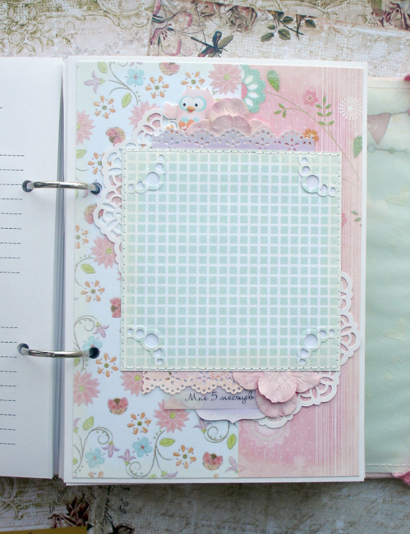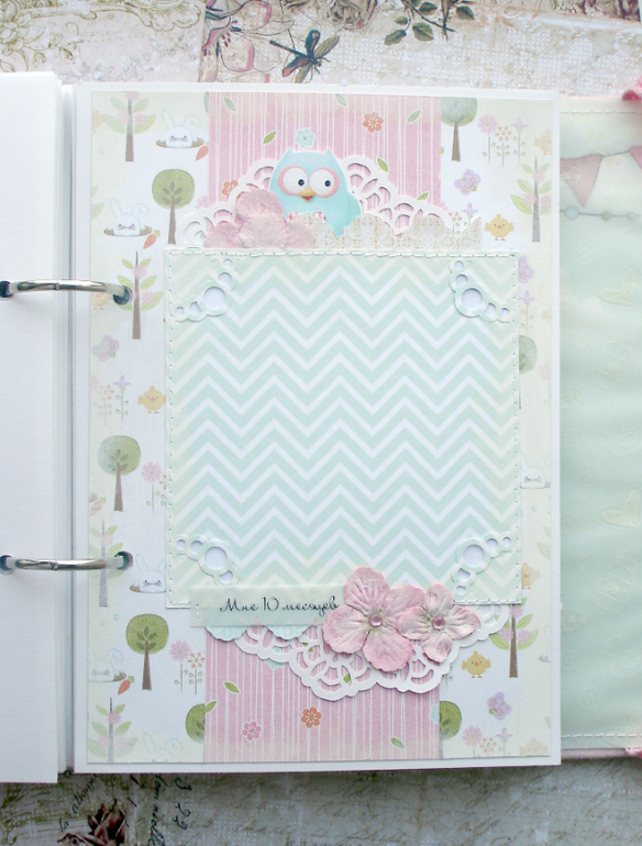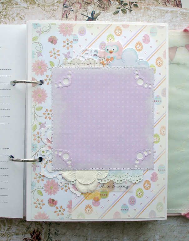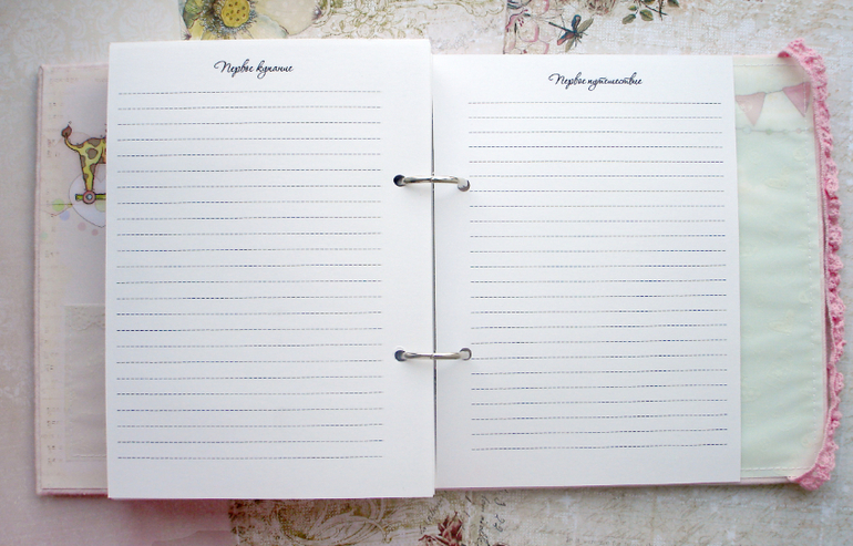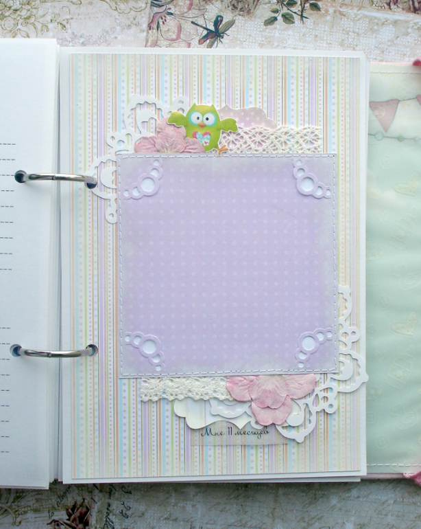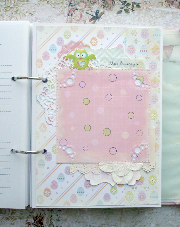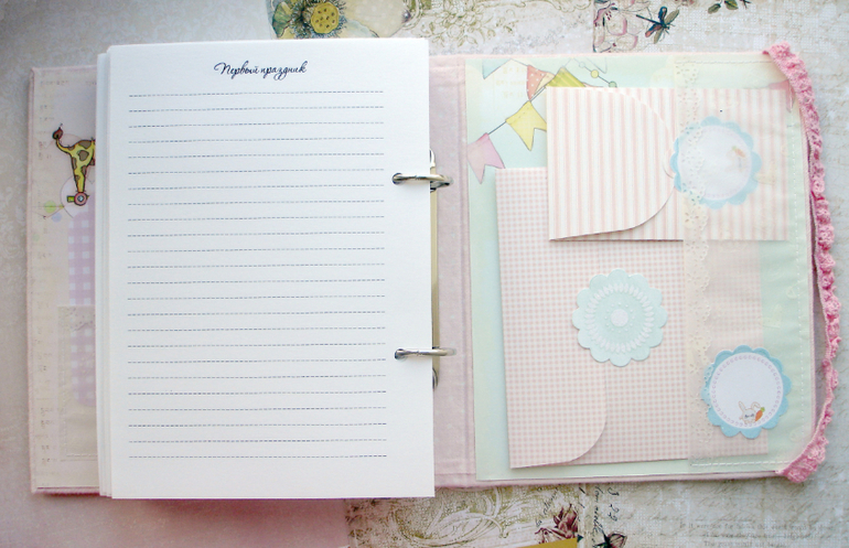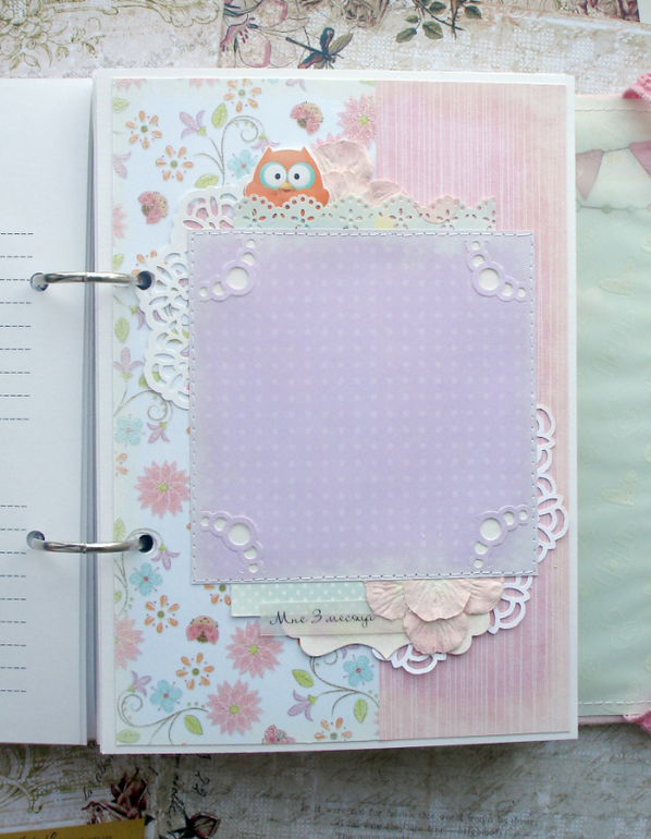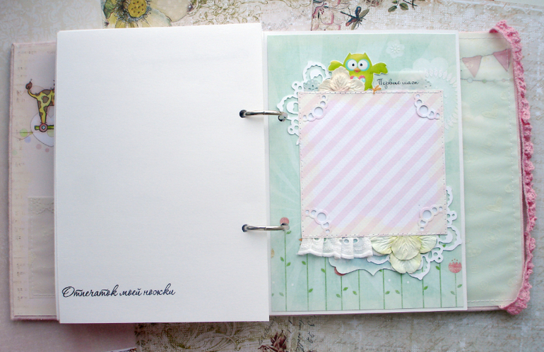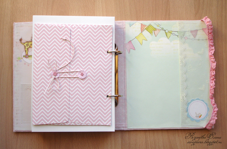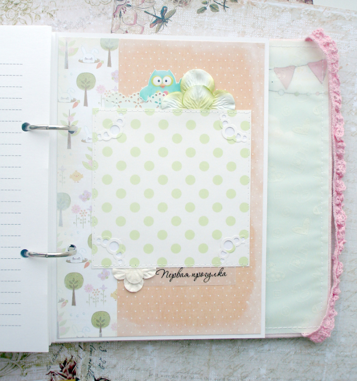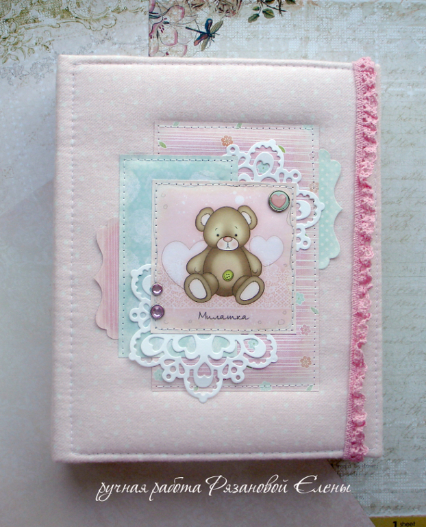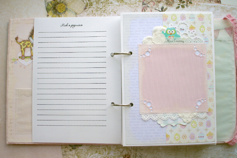 БлокнотыСовсем забыла я про этот блокнот, сделала оооочень давно, сделала на заказ, а заказчица от него отказалась, это первый случай в моей жизни, и надеюсь последний. В итоге, необходимо его пристроить. Обложка фланель розовая в горошек, разделители сидят на разъемных кольцах, блокнот закрывается на кружевную резинку. Разделители (тонированы белым акрилом) по месяцам, отпечатки ручки/ножки, рост зубок, первое: купание и прогулка. Два конверта, 4 тэга в кармашке. НО, ЕСТЬ ОДИН НЕДОСТАТОК, кармашки на форзацах были сделаны из велума Мр.Пейнтер и прошиты, но почему то, спустя какое-то время, они пошли волной (на фото видно), почему это произошло - понятия не имею, может быть при наклеивании форзацев ацетон из клея проник в него и это химическая реакция - я не знаю, но переделывать у меня желания нет. Поэтому цена символическая. А может кто подскажет благотворительный аукцион, у меня есть пара работ, для пристроя, могла бы поучаствовать в благородном деле.