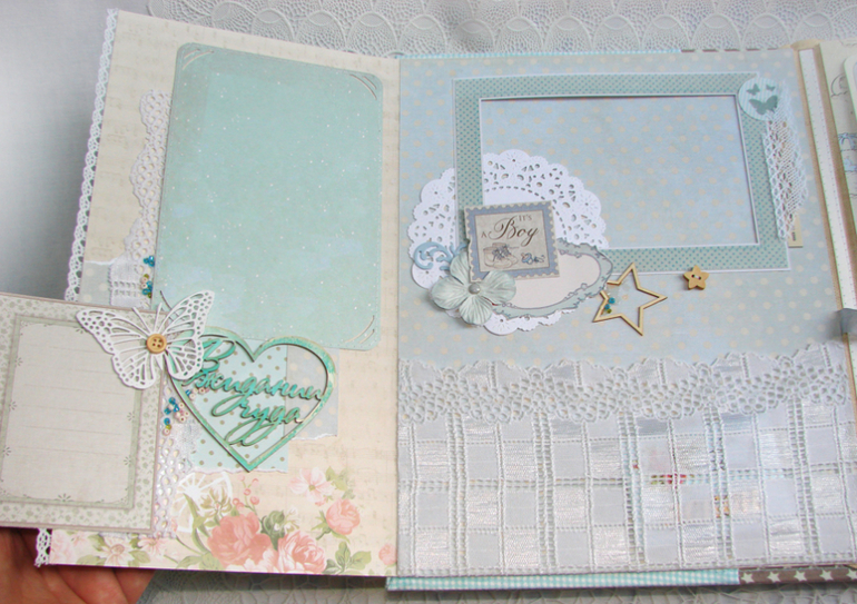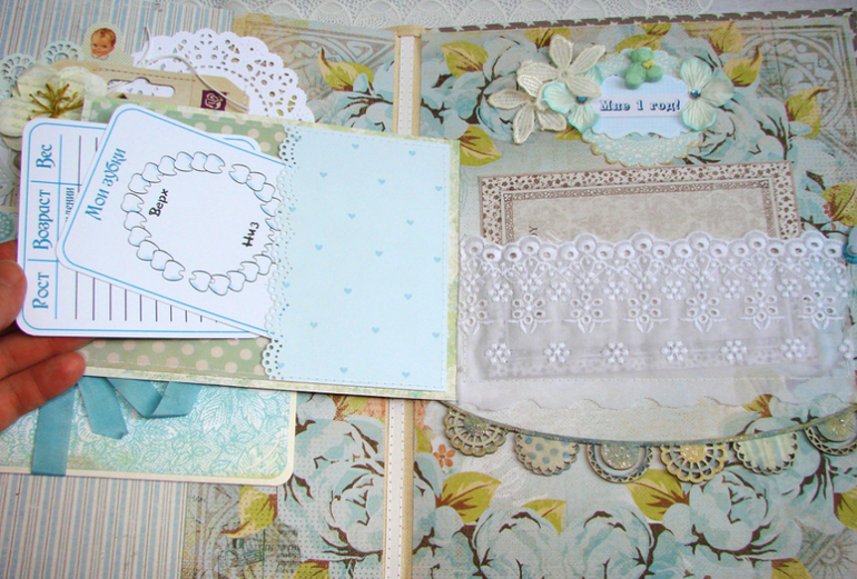 Можно вместить до 60 фото. Фото вставляются в уголки или рамочки, есть несколько кармашков. Есть места для важных записей, дат. Большой кружевной карман для бирочек и конвертика с первым локоном. Карточки для заполнения роста, веса, зубов.