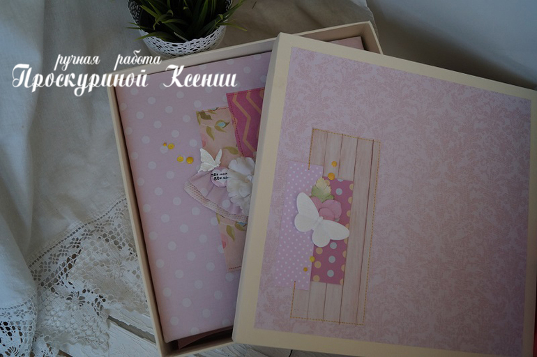 Еще один большой альбом в жестком переплете, 30на30см с мягкой текстильной обложкой. Для удобства хранения альбом в коробке.