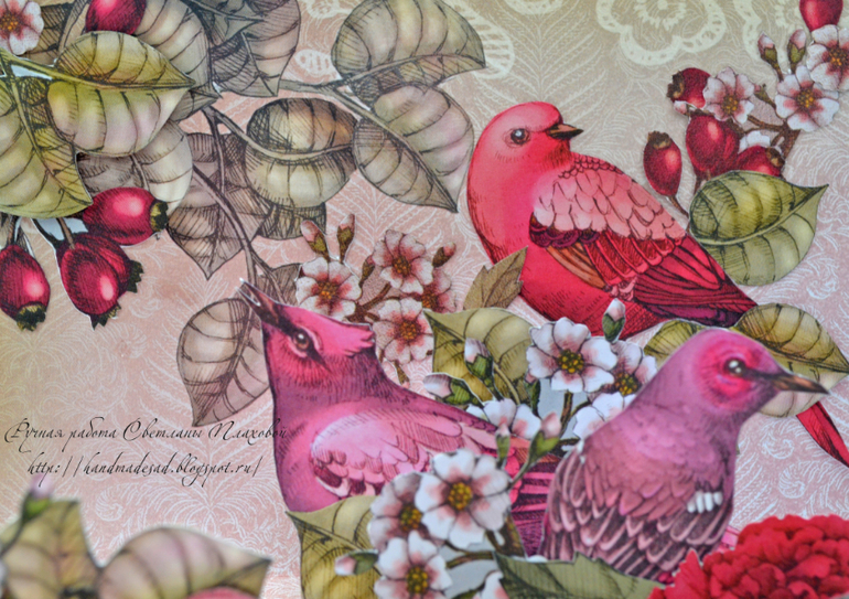 Птички расположились на ветвях дерева и так же утопают в цветах)