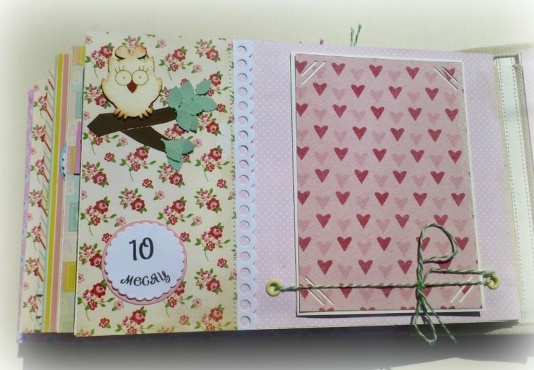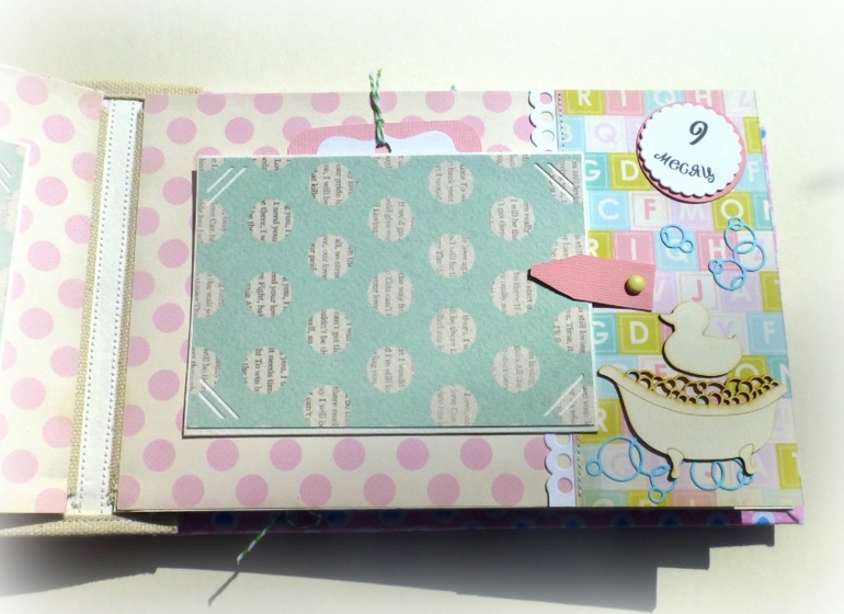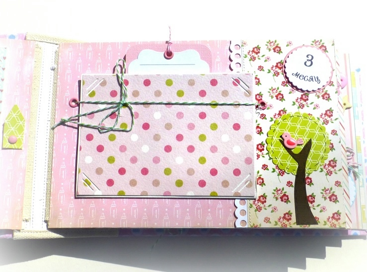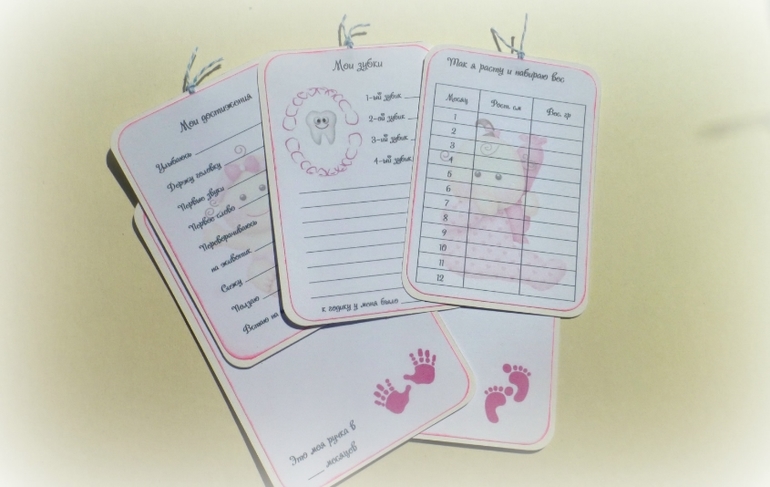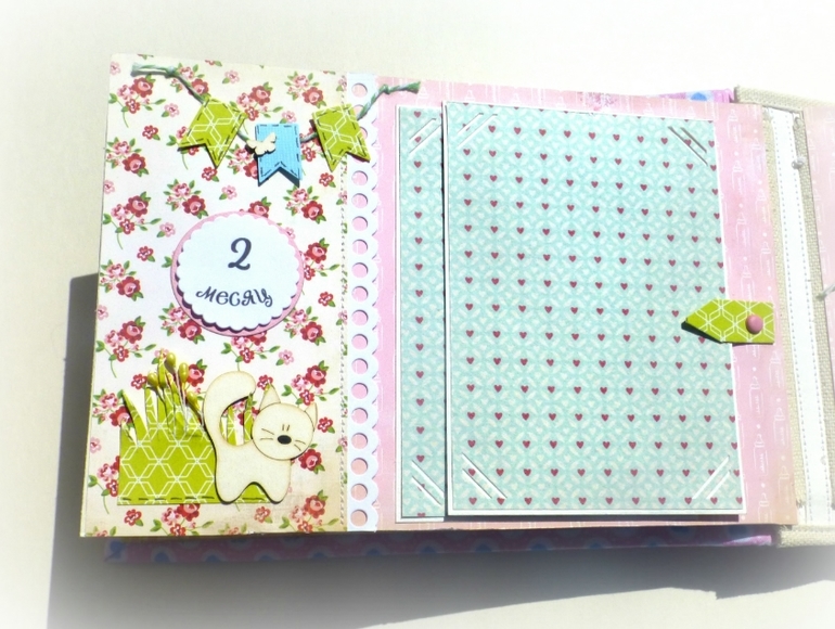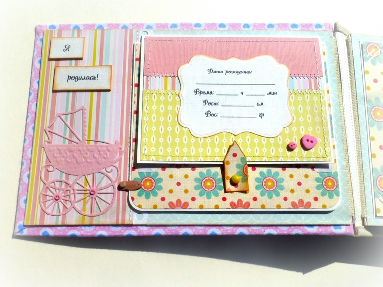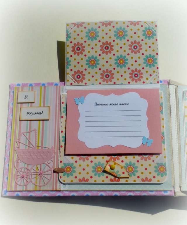 Альбом состоит из 7 разворотов, 14 тематических страниц: "я родилась"; "1-12 месяцев"; "карточки для записи достижений". ивмещает 40 фотографий 9х13см, имеются тэги - для записи важных событий.