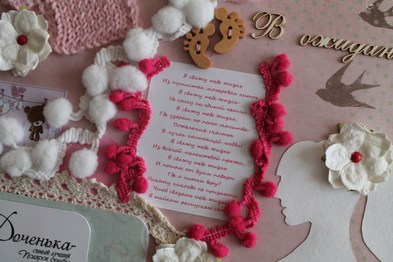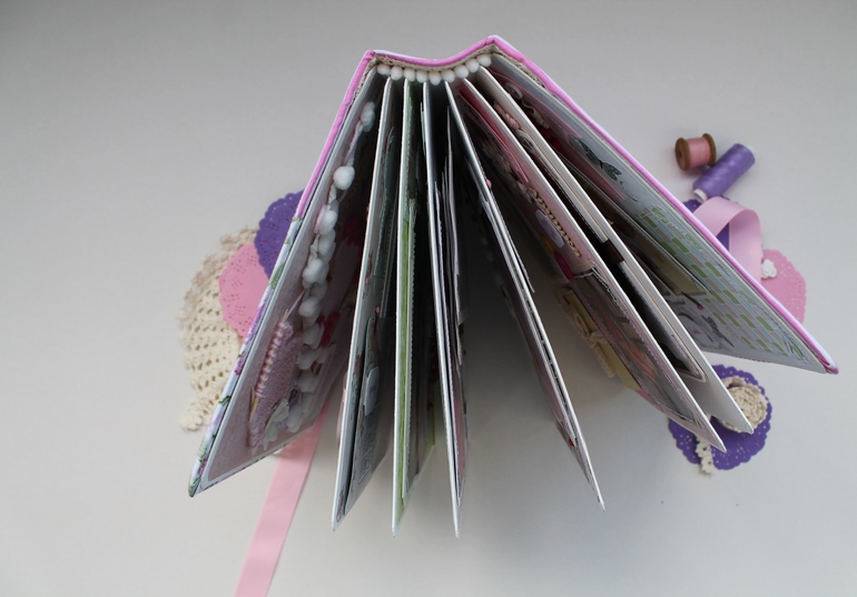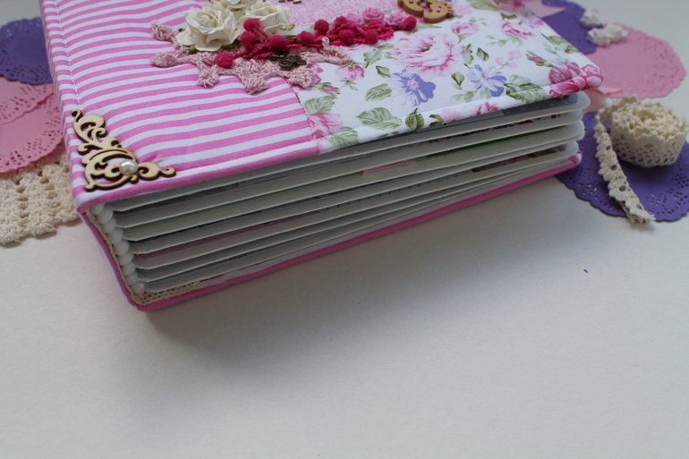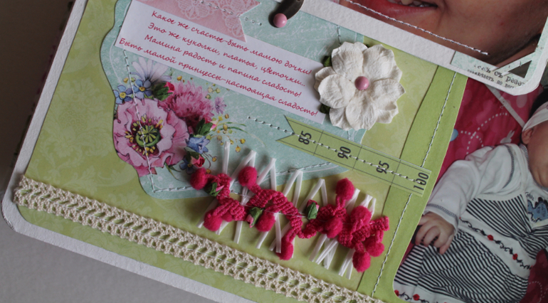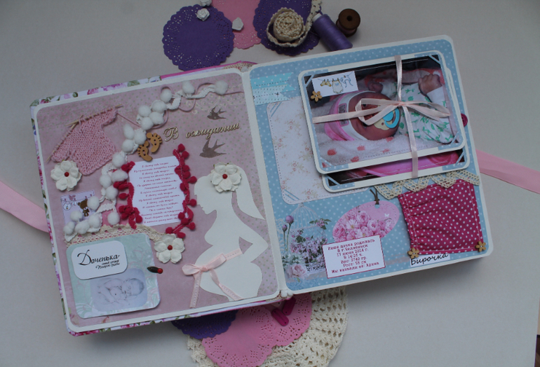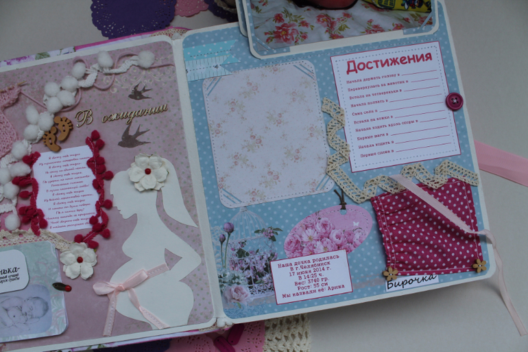 Альбомы ДетскиеОчень долго я трудилась на этим альбомом почему-то,когда меня не ограничивают по срокам,то я начинаю ленится и свободное время уходит на какие-то другие дела нежели шитье альбома,но получился вроде красивый,оцените сами.Альбом 23 на 25 см,7 разворотов(14 страниц),вмещает около 70 фотографий,в мягкой хлопковой обложке.Вмещает в себя фотографии с рождения и до года.Пока клеила,стихотворение на первой странице пробило до слез,на последних двух строках прям комок в горле каждый раз как читаю...Содержит снимки УЗИ,кармашек для бирки,локона,таблицу самых важных достижений и количества зубов.