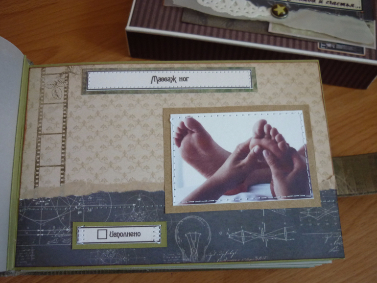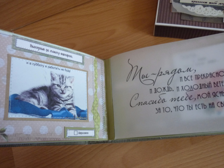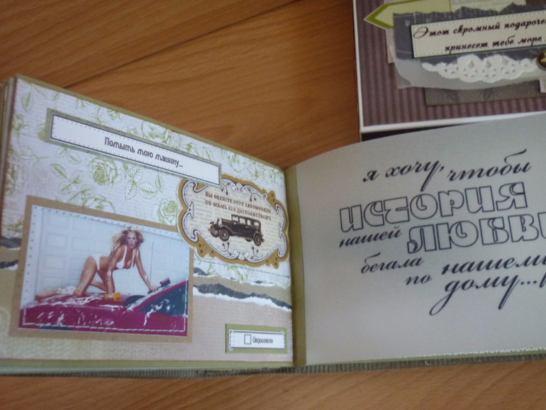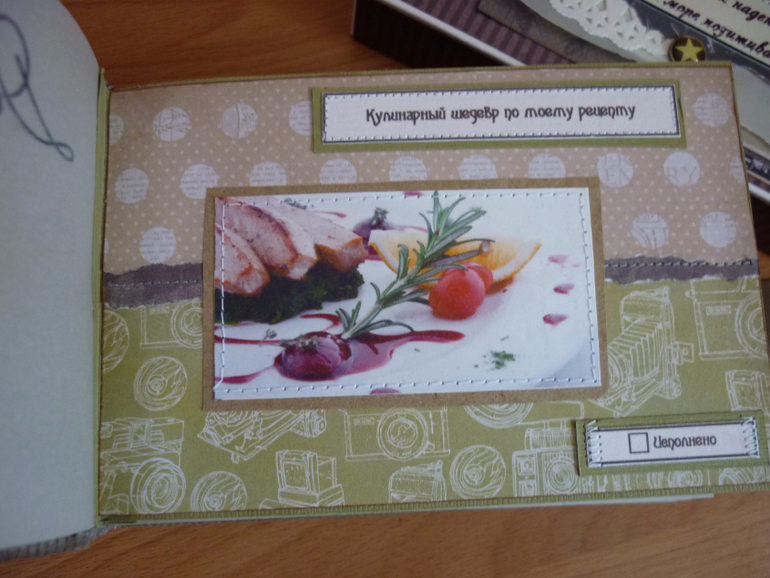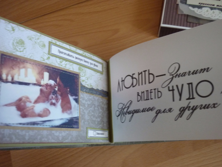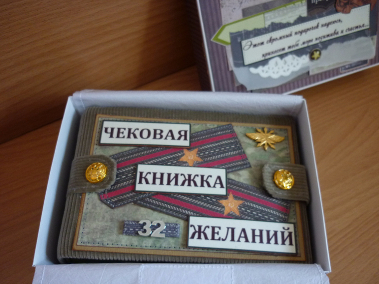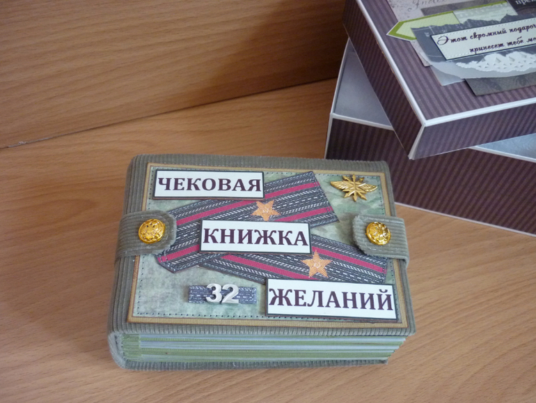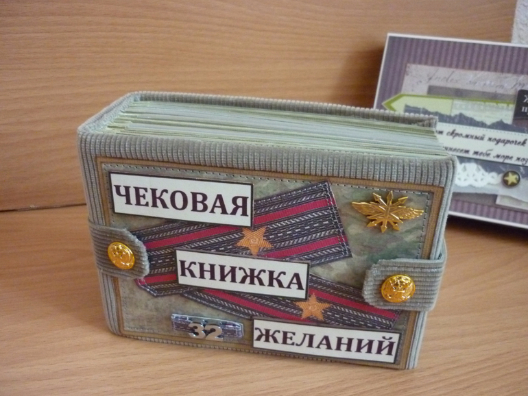 Книги пожеланий, чековые книжки, книжки желаний, кулинарные книгиПривет. А у меня готов новый заказ. Это чековая книжка желаний на 32 желания и 3 бонуса, со вставками из кальки с пожеланиями (М.Абрамова), получилось такая увесистая книжечка. Владелец военный, поэтому обложка с намеком (надеюсь понравиться). Как всегда она будет храниться в коробочке. Фото не всех страниц. А так, смотрим...