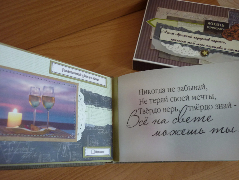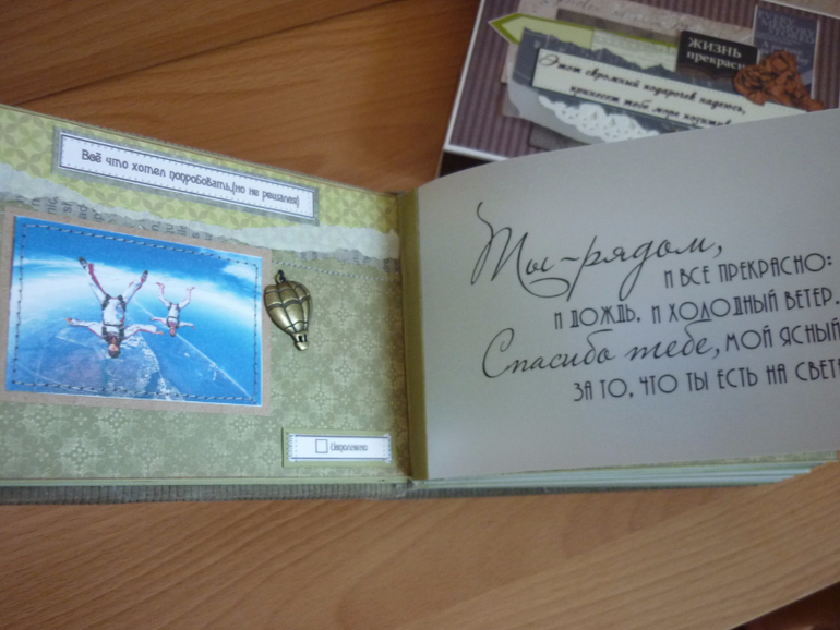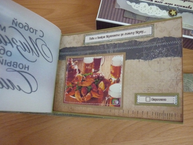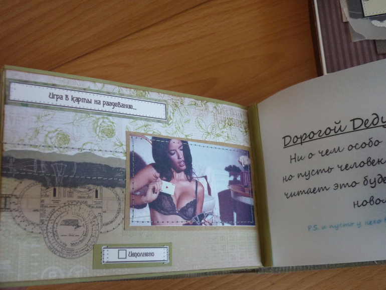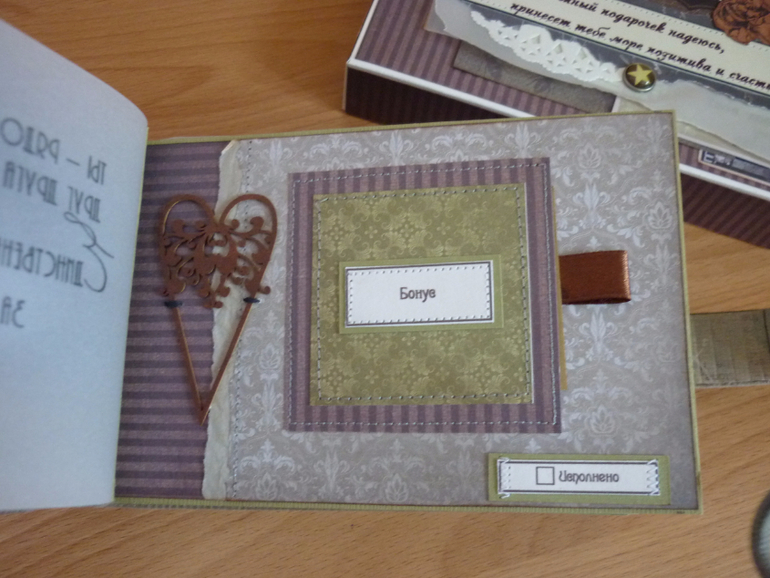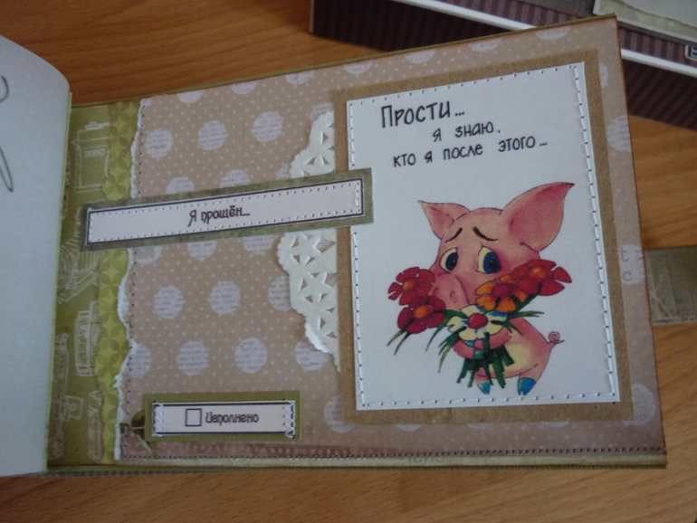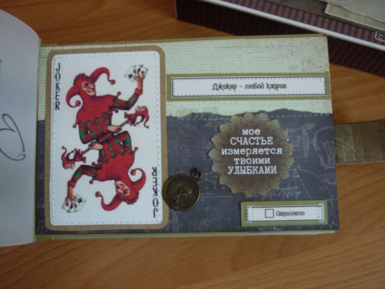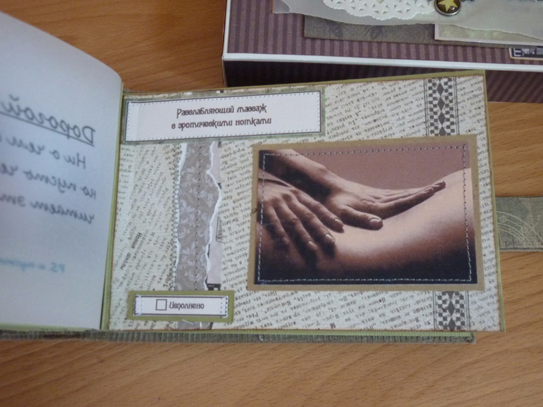 Книги пожеланий, чековые книжки, книжки желаний, кулинарные книгиПривет. А у меня готов новый заказ. Это чековая книжка желаний на 32 желания и 3 бонуса, со вставками из кальки с пожеланиями (М.Абрамова), получилось такая увесистая книжечка. Владелец военный, поэтому обложка с намеком (надеюсь понравиться). Как всегда она будет храниться в коробочке. Фото не всех страниц. А так, смотрим...