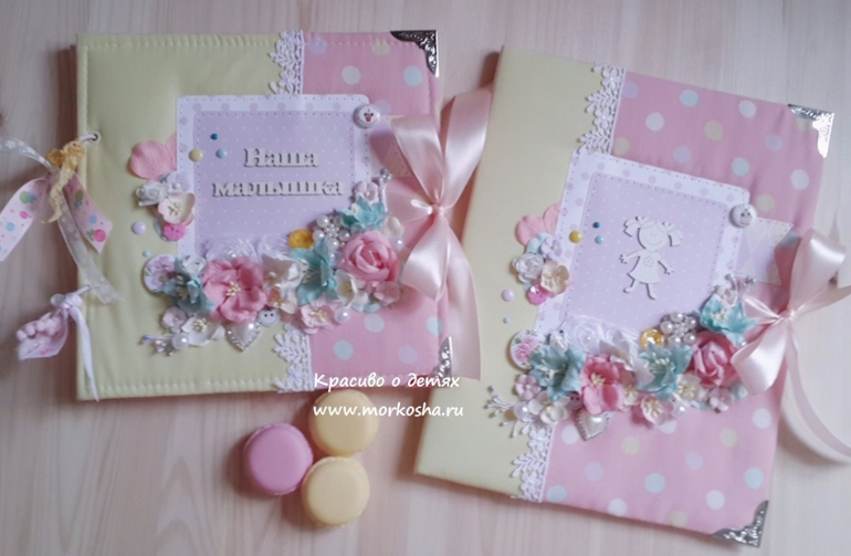 Альбомы ДетскиеКомплект состоит из фотоальбома 22х22см, 30 листов плотной розовой бумаги, 6 табличек-наблюдений от 0 месяцев до 1 года. Также в комплект входит папка формата почти А4 с 3 прозрачными кармашками для первых документов - Свидетельства о рождении, ОМС и Пенсионной карточки.