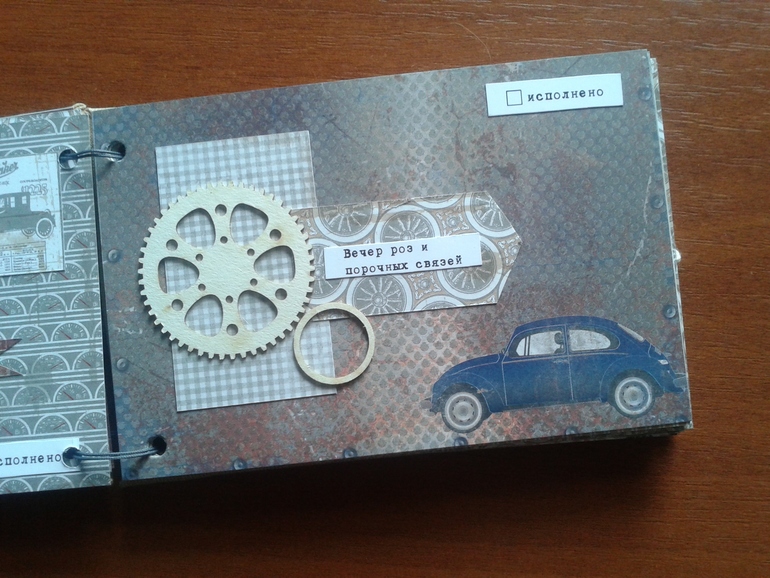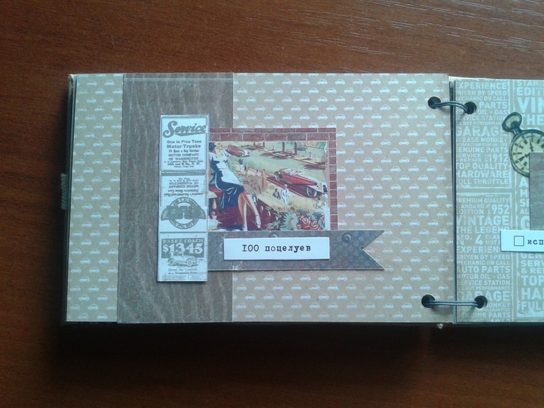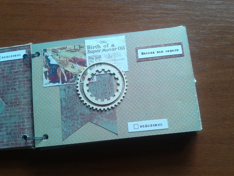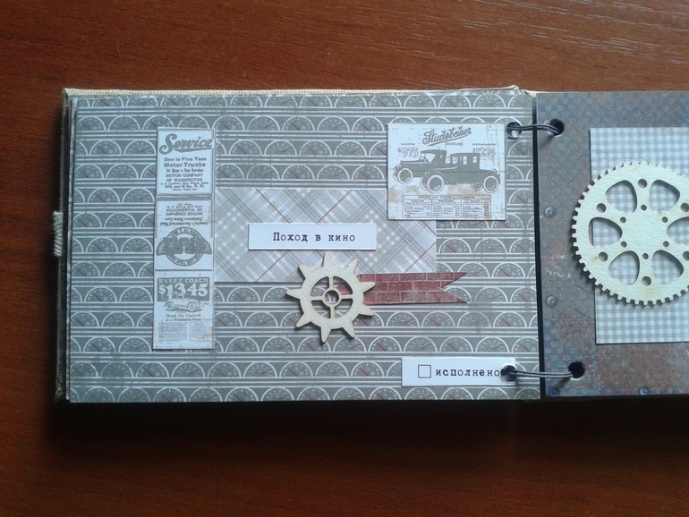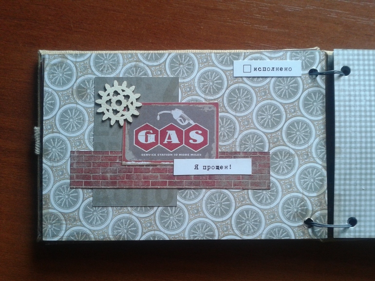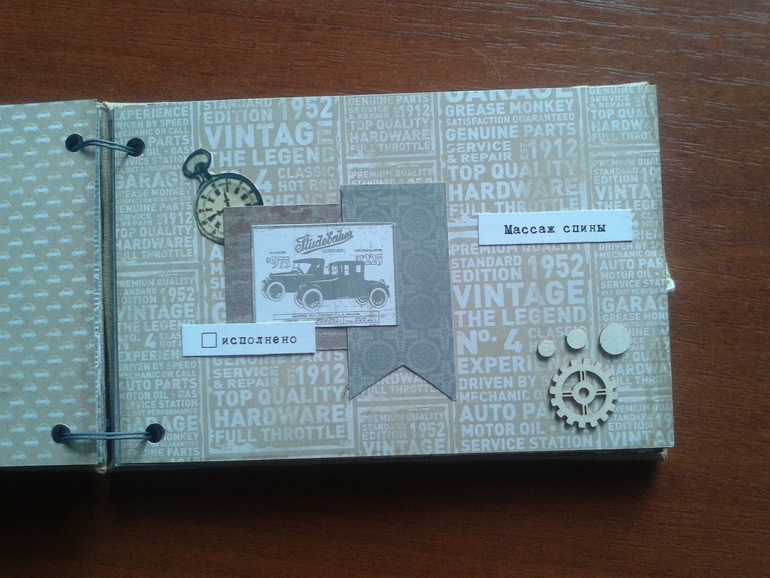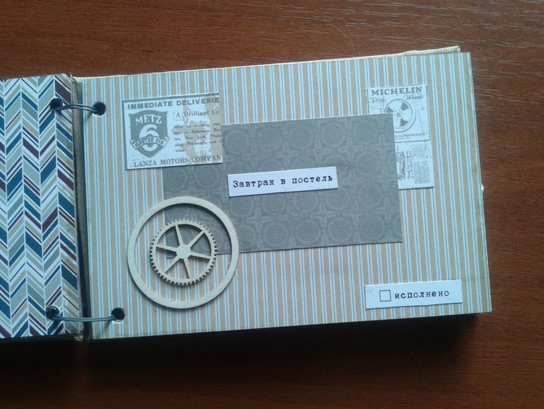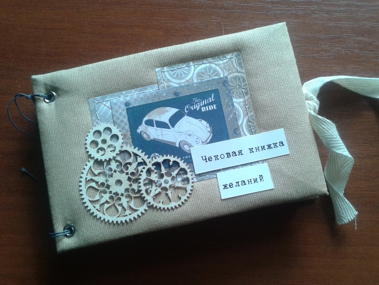 Книги пожеланий, чековые книжки, книжки желаний, кулинарные книгиПривет, девочки! Всех с праздником!!! А у меня сегодня еще один праздник - 8 лет назад зародилась наша семья))) и решила я сделать мужу чековую книжку желаний. Побуду его джином на некоторое время) Хотела взять бумагу по листу, но ничего подходящего не нашла. Пришлось взять маленький набор бумаги Authentique (вроде правильно написала), из украшений использовала только вырезки из бумаги и чипборд шестеренки. Книжечка размером 10×15 см; мягкая тканевая обложка, 20 желаний. Первый раз работала с мужской тематикой: понравилось, но трудновато....все таки детская мне как то ближе. Делала в спешке ( тк сыночек мой последнее время очень плохо спит и днем, и ночью....и хочется побольше успеть, если есть время. Прошу к просмотру: