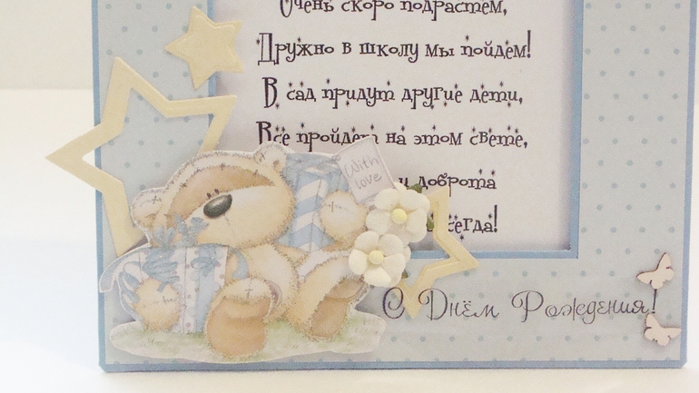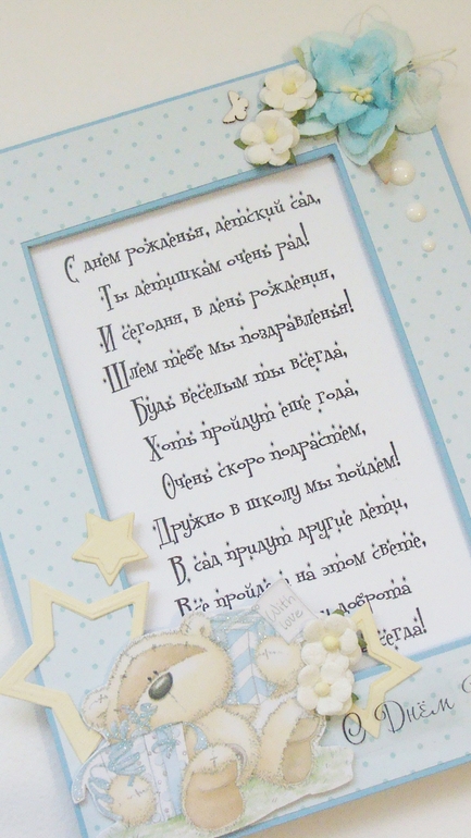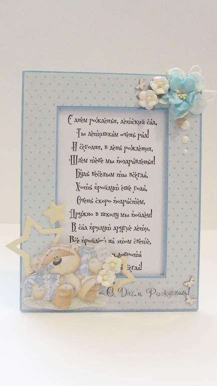 3. Сегодня у нашего детского сада, куда ходит моя младшая дочь, день рождения - 1 год. Садик суперский. Воспитатели классные. И мы с дочей подготовили для садика подарочек: рамка. Сейчас в нее вставлено поздравление, а потом его можно заменить на имена деток-именинников. Материалы: остатки коллекции Физзи Мун, тайские цветочки, чипик и вырубка, а, и дотсы еще