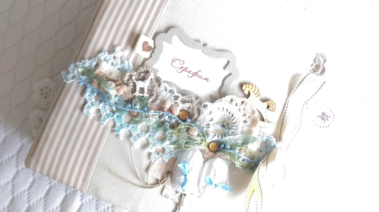 для малыша про его первый годик. Есть кружевные кармашки для бирочек,фото узи, отпечатки ручек-ножек, карточки достижений и роста-веса. В альбоме много кружева ручной работы, цветочком и пинеточки на обложке тоже ручная работа._)