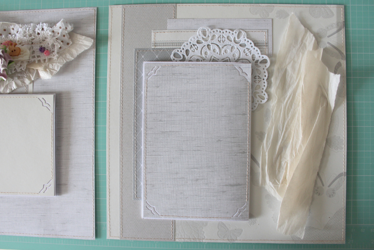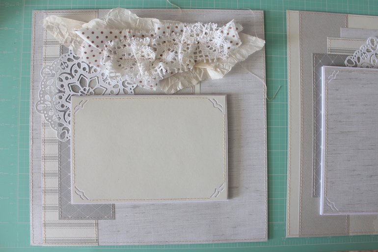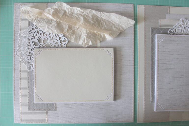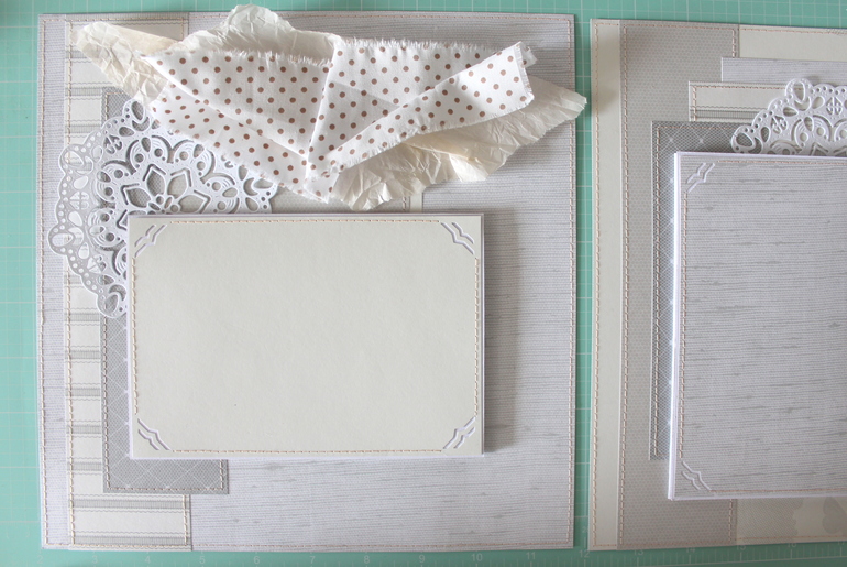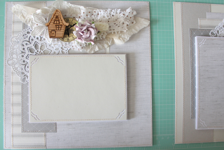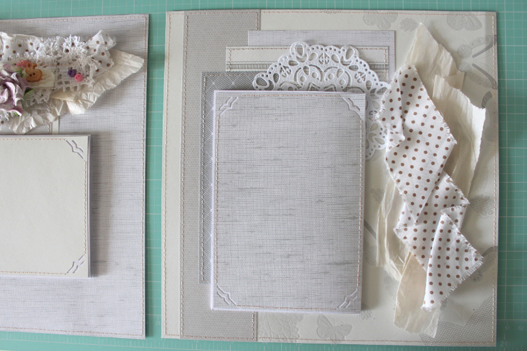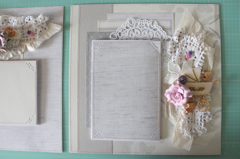 Из тех обрезков, которые у нас остались после нарезания основ для страниц альбома, я начинаю формировать бумажные слои, чередуя светлые тона с темными, а активные рисунки - с пассивными. Обязательным условием для меня в этой работе всегда является использование одинаковых рисунков и тонов на обеих страницах разворота!Добавляю вырубку фигурной салфетки поверх слоев и тем самым создаю ощущение воздушности странице