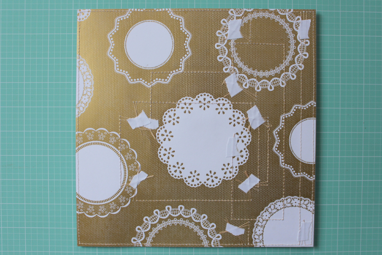 Перетягиваю ниточки на изнанку, завязываю узелки и прихватываю для надежности скотчем (аналогично, как с подложками под фото, которые мы готовили в этапе №2)