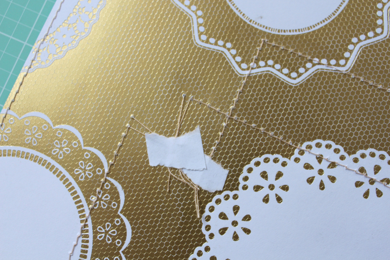 Снова перетягиваю ниточки на изнанку, завязываю узелки и прихватываю скотчем. Мне для работы досталась не простая бумага потому, что тыльная ее сторона блестит и скользит.