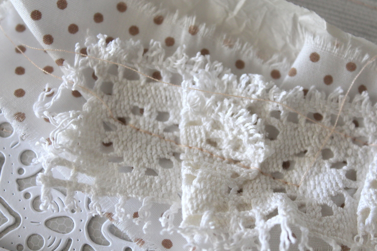 Добавляю натуральное кружево и прихватываю в нескольких местах машинной строчкой стразу все слои. Вы, если хотите, все эти слои можете переплетать друг с другом, а не просто один на другой накладывать