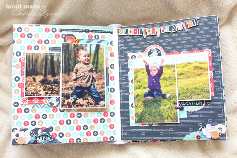 Разворот очень милый! Нежный и мальчиковый. Добавила бы бумажных слоев под раскладушку справа потому что под композицией их практически не видно. Еще прострочила бы странички по периметру. Затонировала бы пуговички. И под кружево добавила бы какой-то ткани...хлопка, льна или шитья ;)