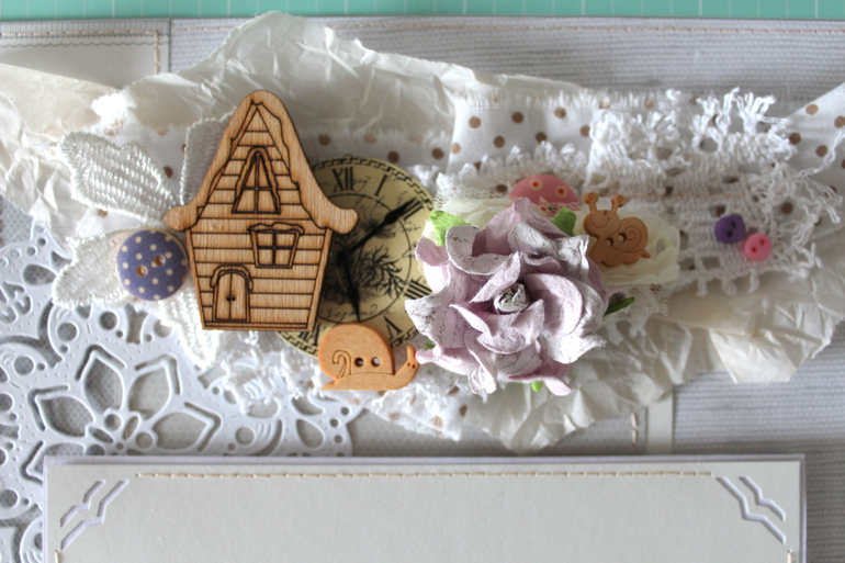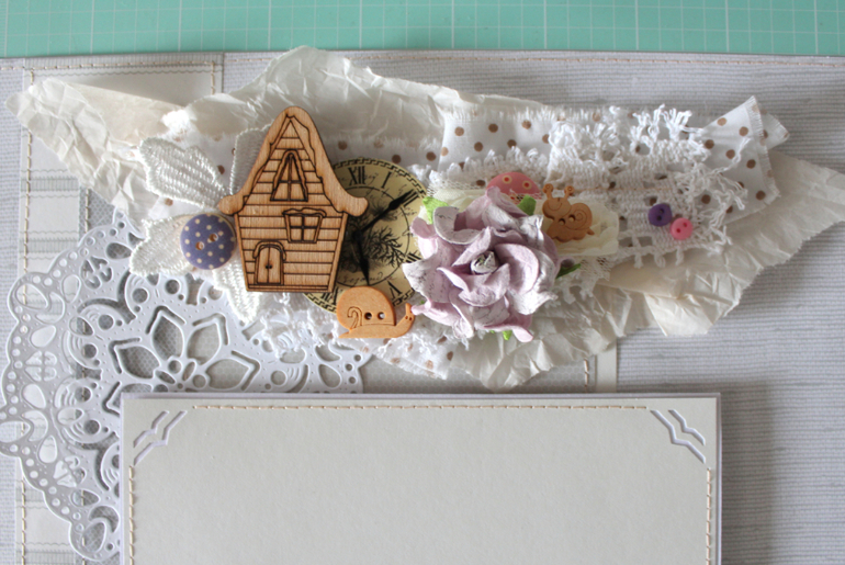 Перетягиваю ниточки на изнанку, завязываю узелки, прихватываю скотчем и начинаю раскладывать декор дальше. За основу беру домик, который символизирует первый приезд малыша домой из родильного дома. Вокруг домика складываю композицию из декора разной формы и фактуры, но в выбранной для альбома цветовой гамме и обязательно читающейся тематики. В моем случае часы - рождение новой жизни, сиреневый цветок - выбранная гамма альбома заказчицей, лента из текстильных роз бежевая - поддержание горизонтальной композиции в мелком декоре