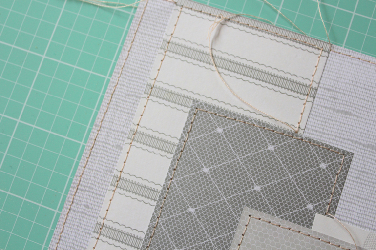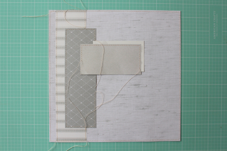 Теперь я прихватываю все слои (кроме раскладушки) на двусторонний скотч и по периметру прострачиваю. Если вы решили сделать карман под раскладушкой для карточки для записей, то обязательно прострочите полностью все нижние слои бумаги для того, чтоб карточка могла свободно двигаться и не за что не цепляться. Также в этом случае самую нижнюю подложку для фото на раскладушке стоит прострочить с того края, где у вас планируется карман поскольку позже вы этого сделать уже не сможете.