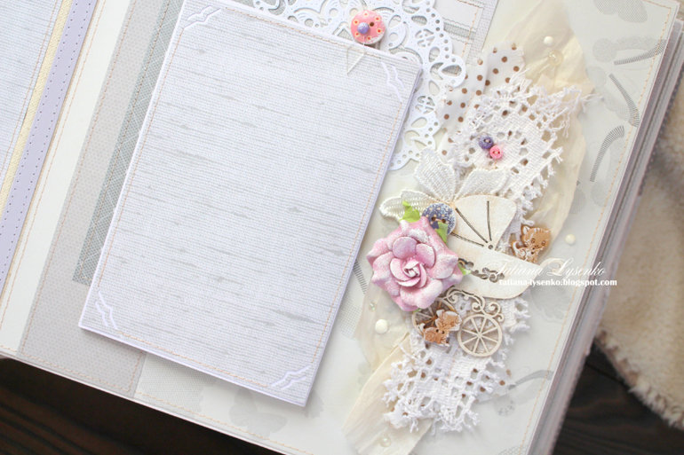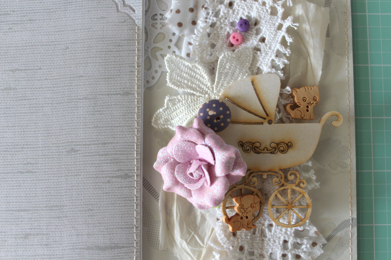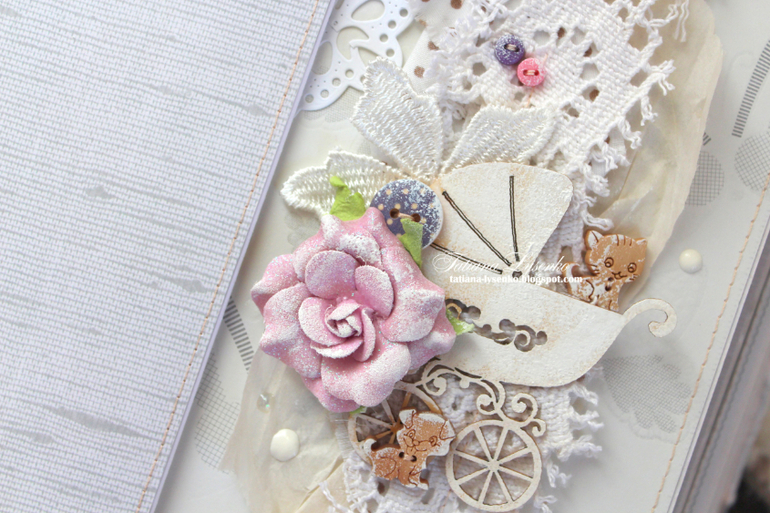 Теперь все тоже самое я проделываю с правой страничкой. Обязательно использую в декоре двух страниц одного разворота одни фактуры, одни оттенки. Далеко не всегда фиолетовая пуговичка справа будет повторятся с фиолетовой пуговичкой слева, но что-то фиолетовое обязательно должно быть...это может быть брадс, дотсы, пуговичка другого размера и т.п.На правой странице во главе композиции у меня коляска, что в принципе продолжает тему левой страницы. В коляске сидит милая кошечка, а под ней - щенок. Обязательно следите за равновесием и логикой в своих композициях. Если кошка сидит, то на чем-то...т.е. не парит в воздухе. Если бабочка присутствует в композиции, то она должна либо сидеть на цветочке, либо лететь сверху. Если это растяжка или гирлянда - то вверху...и т.п.