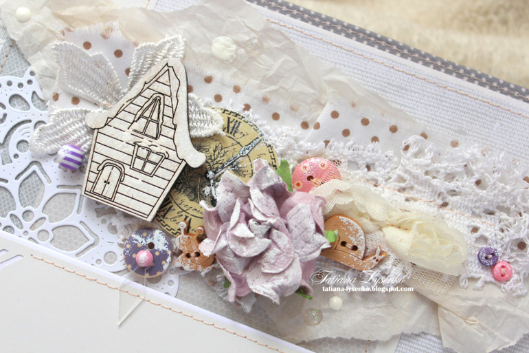 Что касается разворота: композиции выглядят скованными...хочется дать им размаху и немного увеличить слои. Я бы пуговки и цветочки компоновала в одну композицию и не рассредотачивала бы их так сильно по слоям. Затонировала бы белым акрилом. Ангелок на левой странице ооочень милый! ;)