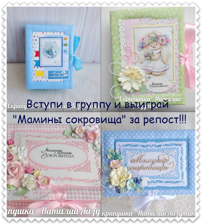 Наталия Скрапушка в Скрапбукинг (бумажный) 10 лет Розыгрыш "Маминых сокровищ" Объявления о конфетах, проведение МК и ярмарок Всем привет!!! Предлагаю поучаствовать и выиграть шкатулочку с "МАМИНЫМИ СОКРОВИЩАМИ"! Подробнее в группе https://vk.com/club68938742 Посмотрите еще 20 записей на эту тему Отменить Ответить Анонс МК в октябре! Приглашаю на мой МК в октябре Чаты Беременных Выберите чат: Январята-2026 Февралята-2026 Мартята-2026 Апрелята-2026 Майчата-2026 Июнята-2026 Июлята-2026 Августята-2026