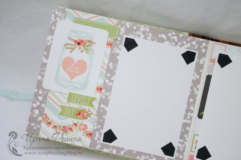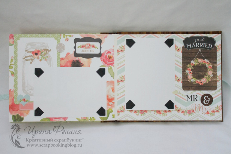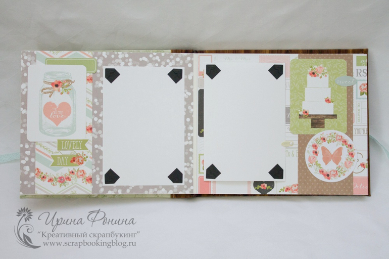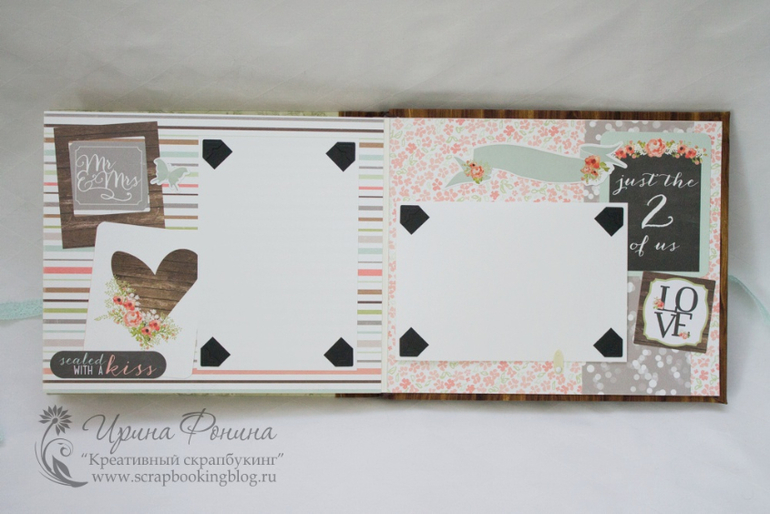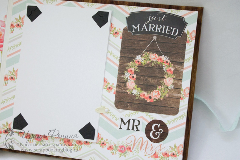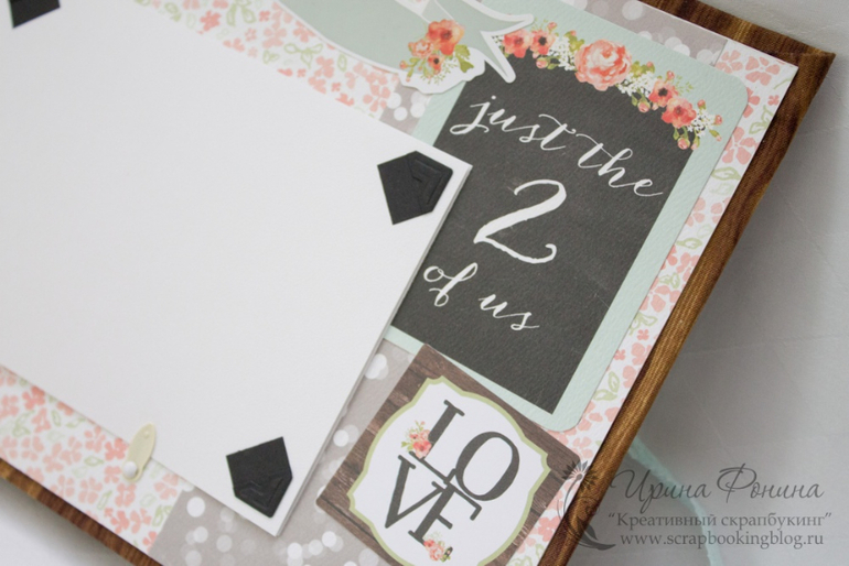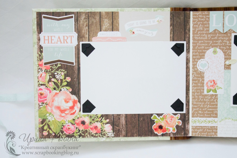 Альбом сделан из шикарной бумаги Carta Bella новой коллекции Rustic Elegance, которая отличается высокой плотностью и очень приятной текстурой. В оформлении тоже использованы деревянные фоны в сочетании с нежными цветочными мотивами.