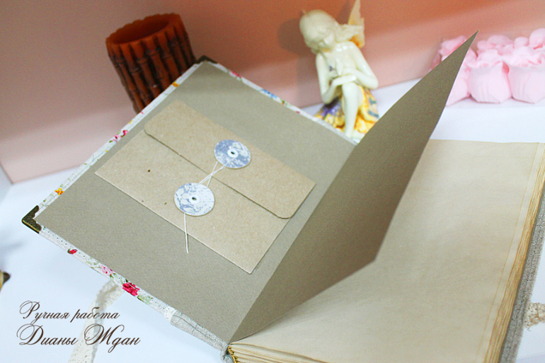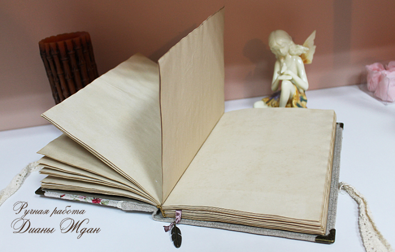 Блокнот формата А5, 90 состаренных в кофе с ванилью страничек, обложка лен, завязывается на кружево, на переднем форзаце небольшой конверт, на заднем карман. И РОСКОШНЫЙ АРОМАТ!!! Я так этот блокнот полюбила, что не хочу с ним расставаться, но не знаю, как его использовать, блокнот творческий у меня уже есть)))