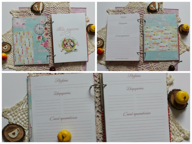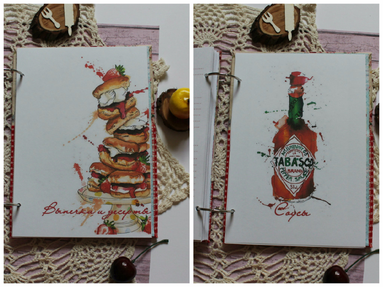 ... Делаю их редко:) ,но когда приходит вдохновение и есть "вкусные" материалы под рукой- бумажка/ украшалки/ ткань в тему - то грех не воспользоваться такой возможностью :) вот так и сложилась на одном дыхании эта кулинарная книжечка. Формат А5, внутри 100 страничек для записи любимых рецептов. Есть 6 разделов: * супы *рыба,мясо,птица * овощи и грибы *салаты и закуски