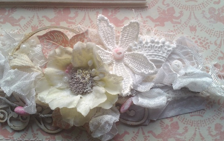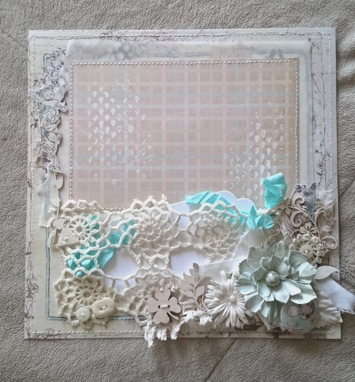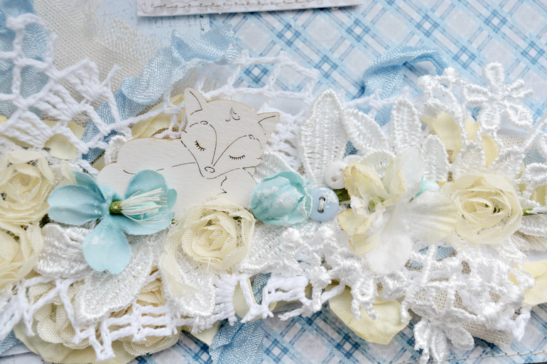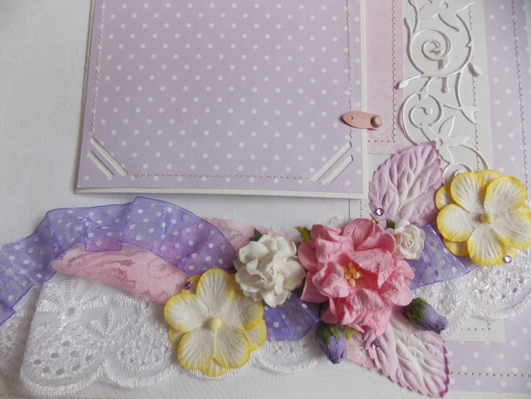 - ОЭ первого разворота - многослойность. В вашем развороте должно быть не менее 5-ти слоев из которых 2 обязательно должны быть текстильными. В моем развороте всего 9 слоев из которых 4 слоя из коллекции бумаги+1 слой бумаги тишью+1 слой прошвы+1 слой хлопка+2 слоя кружева. Прошу заметить, что один белый текстильный цветок я за слой не считаю.