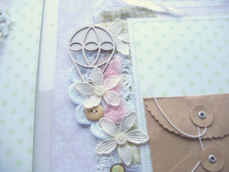 - ОЭ второго разворота - пуговичка. Пришивайте их, пожалуйста. Этот факт добавит еще большей нежности и воздушности вашим разворотам ;) У меня на развороте 10 пришитых пуговички: 7 пуговичек-mini, 2 бусины, 1 цветная деревянная круглая пуговица