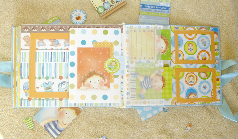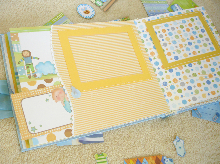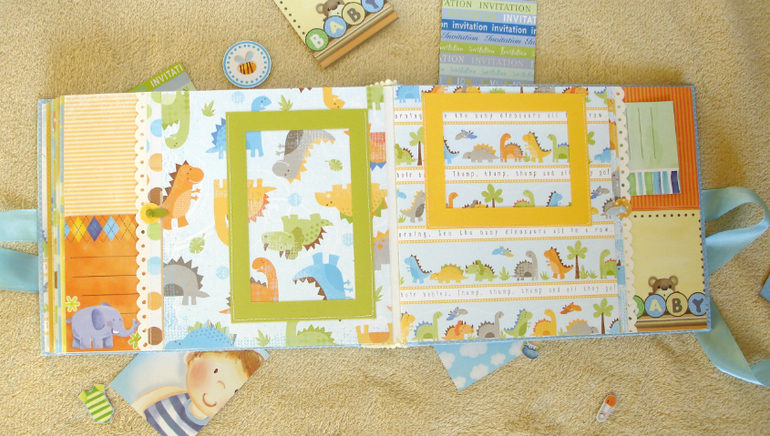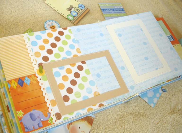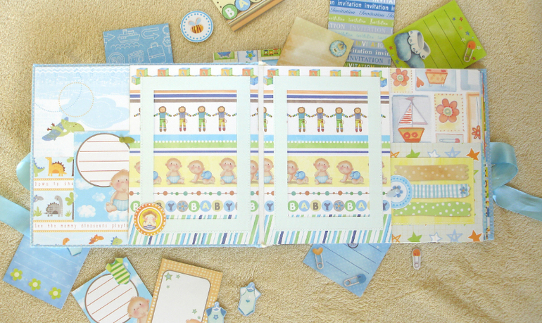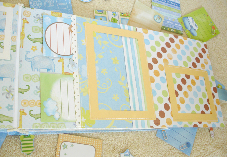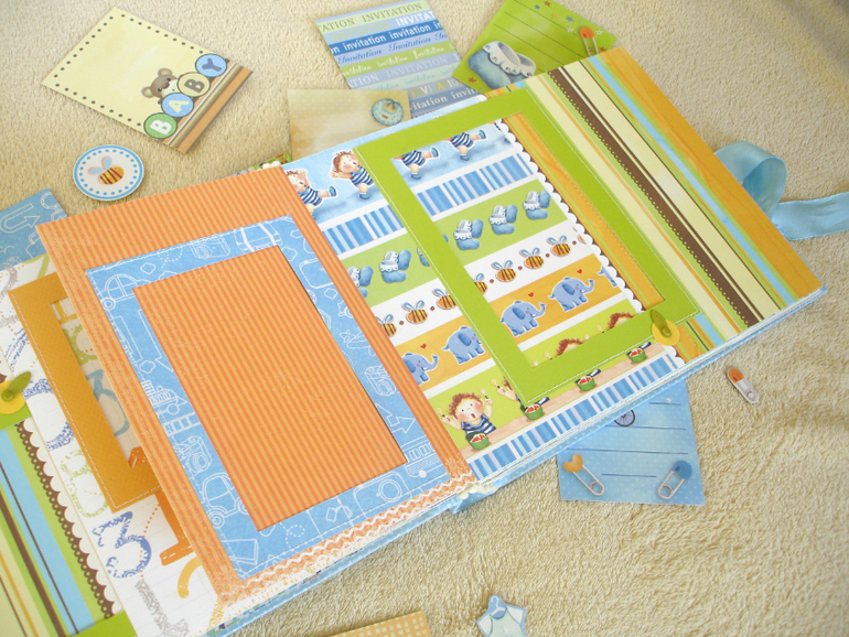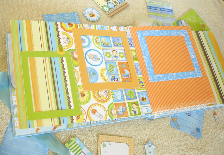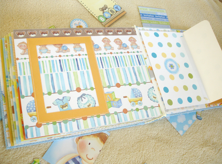 Альбомы ДетскиеОчередная моя "недоделка". Больше года лежит, вздумалось мне как-то "утилизировать" остатки бумаги из разных наборов, остаются по 1-2 листа и болтаются потом, вот решила собрать их в одном месте. Сначала дело пошло быстро, были сделаны развороты и пришиты рамки для фото, сделала переплет Виноградовский, выбрана ткань на обложку и все. Все встало! А так как иногда меня посещают разные "психозы", приспичило мне этот проект срочно выселить! Выбрасывать жалко, а чем украшать альбом - не знаю! Поэтому решила страницы вклеить, обложку сделать и продать как альбом для самостоятельного декорирования. На каждом развороте есть "открывашки", рамки для фото пришиты, но они не все рассчитаны на стандартные размеры фото!!!! Есть кармашки для карточек с важными записями, карточки прилагаются, есть конвертик. Переплет сделан для объемных украшений, между страницами 5 мм, но сейчас украшений в альбоме нет, только анкеры, поэтому он немного треугольный.