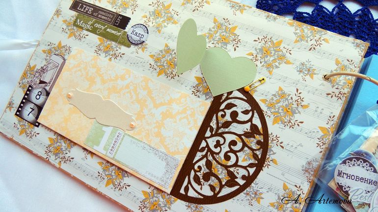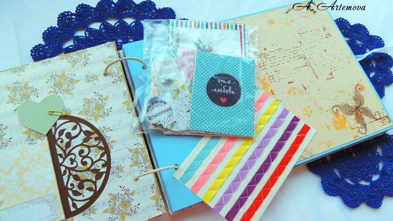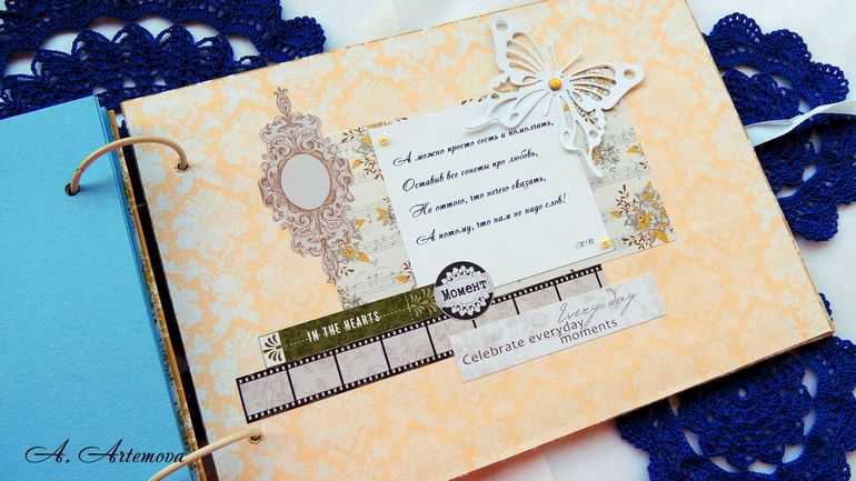 Альбом формата А4, на кольцах, внутри 20 листов, плотностью 300 гр. Некоторые странички задекорированы скрапбумагой. На первом форзаце кармашек с карточками на самые разнообразные темы, два конвертика и уголки для фотографий. На заднем форзаце стих от заказчицы. Этот альбом вместит в себя до 120 фотографий размером 10*15.