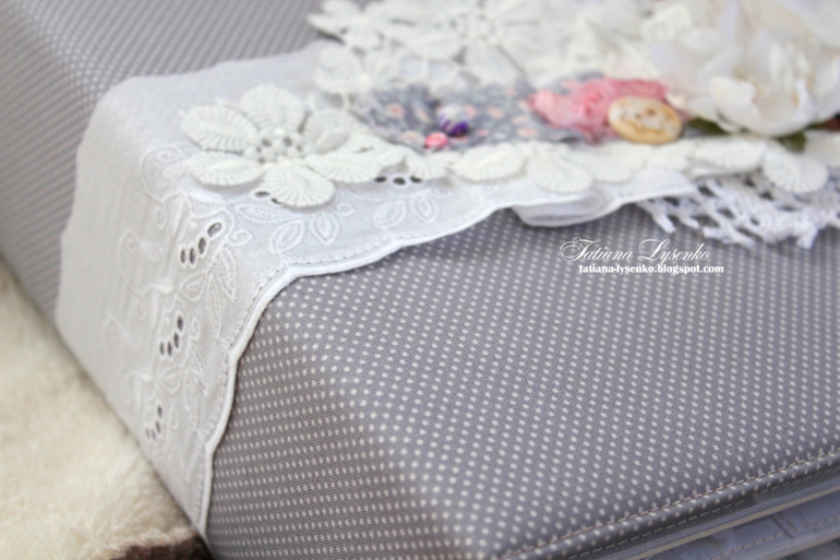 - ОЭ первого разворота - многослойность. В декоре моей обложки всего 5 слоев из которых 1 слой кружевной салфетки+1 слой прошвы+1 слой кружева+1 слой хлопка+1 слой ленты с шебби-цветами. Прошу заметить, что один белый текстильный цветок я за слой не считаю.