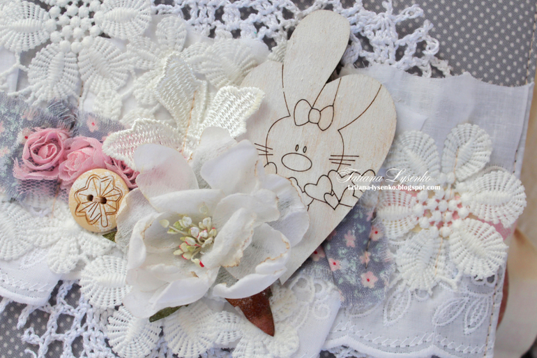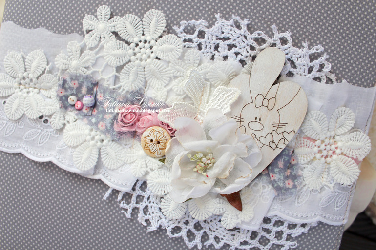 - ОЭ третьего разворота - деревянное украшение. В декоре моей обложки это зайка в сердечках.Спинку альбома я всегда также декорирую, но здесь я вас ограничивать не буду. Если у вас есть желание - можете ее оформить, а если по задумке спинка должна быть без декора - не декорируйте ;)