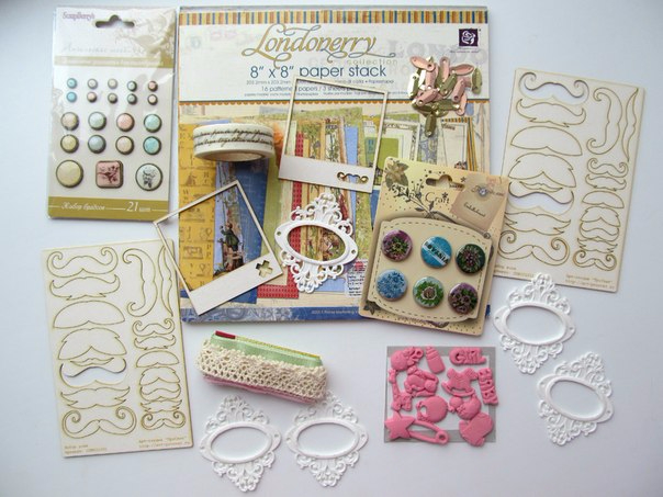 2. Наташа тема - детская (и девчонки, и мальчишки): бумага, пуговки, чипборд, брадс, ткань хлопок, разные украшалки по теме.