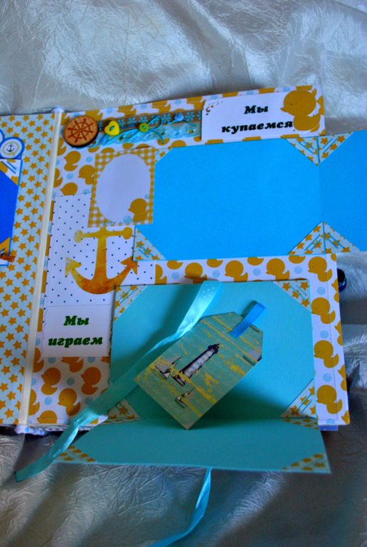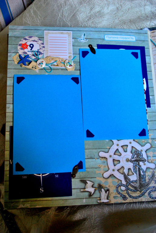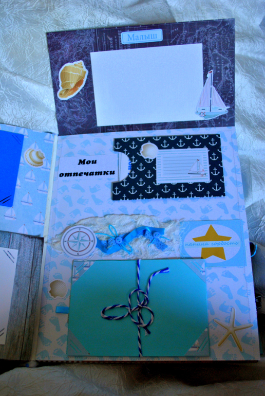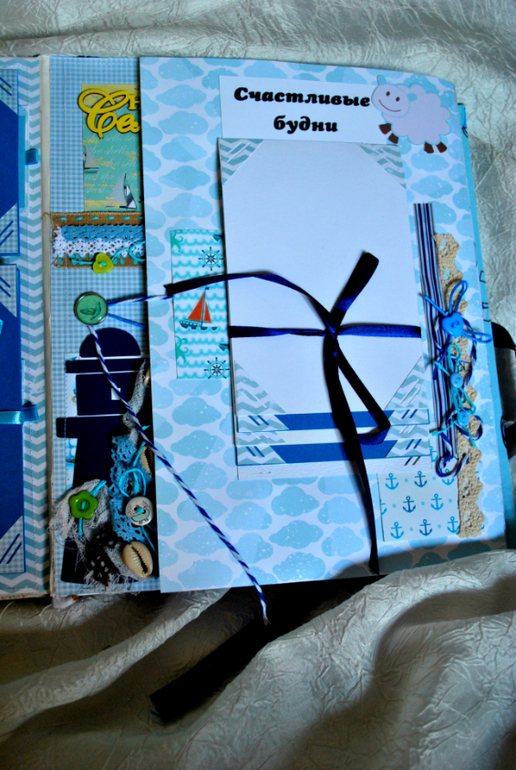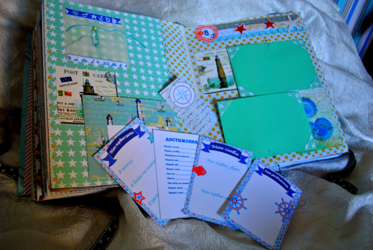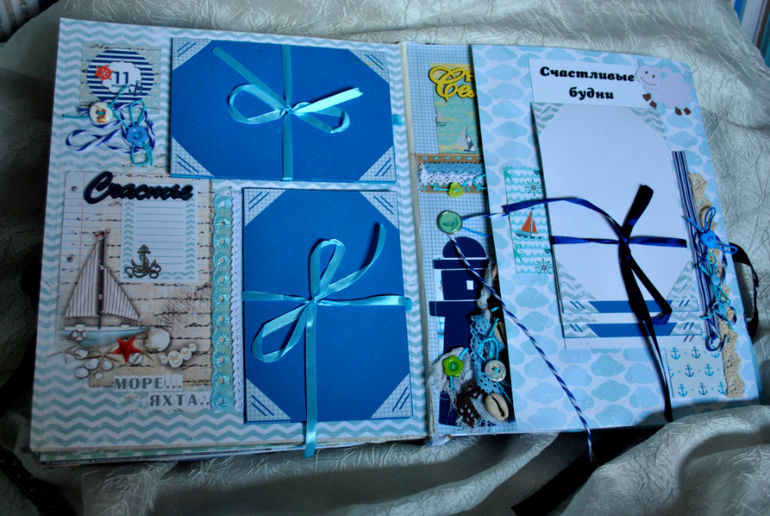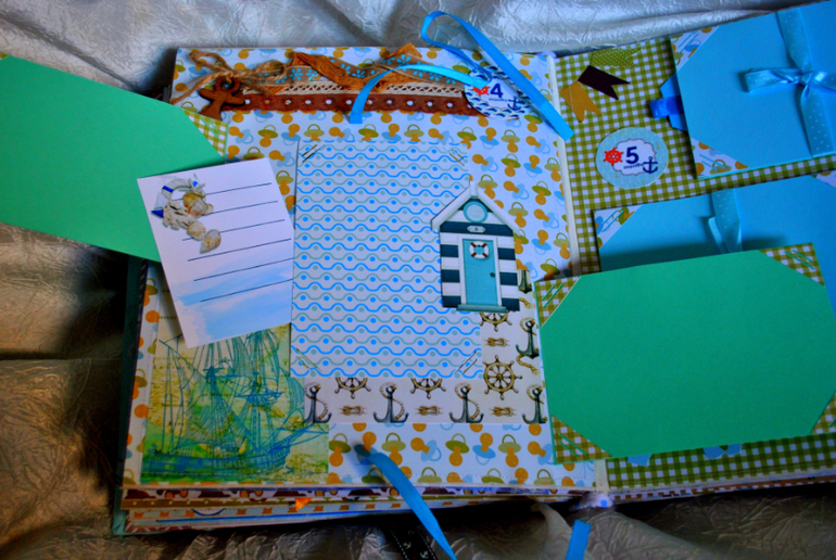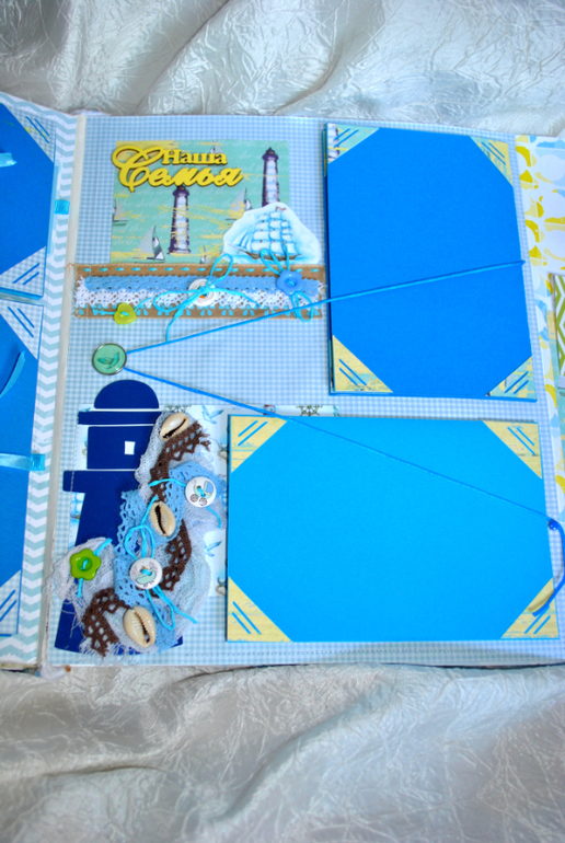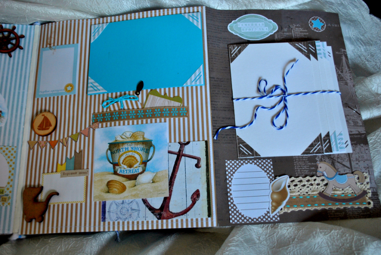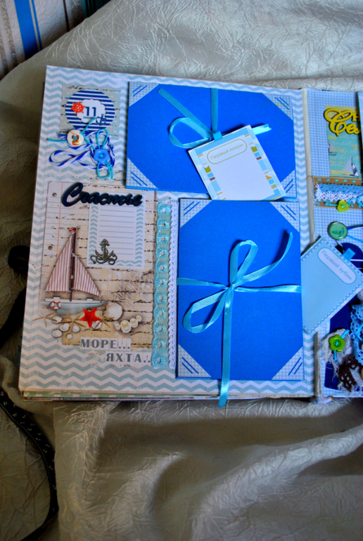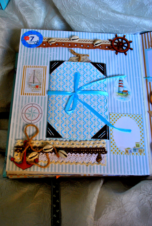 Огромный труд для первого раза! Вы - умничка! У меня только одно замечание - намешаны коллекции бумаги и стили) Если вы выбираете морскую тематику, надо выбрать основные цвета - белый, синий, красный и можно кое-где их разбавить коричневым и песочно-желтым. Или это яркий альбом в американском стиле, но без намеков на море и ракушки) Но в целом - отлично!!!